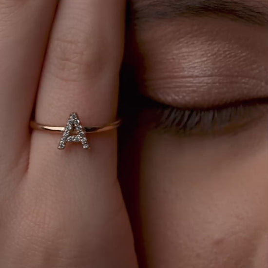 This is a gold initial ring featuring the letter "A" beautifully encrusted with small white diamonds.