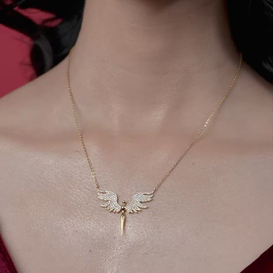 A breathtaking 18k Gold Vermeil angel pendant with outstretched diamond-encrusted wings, symbolizing grace, protection, and celestial elegance.