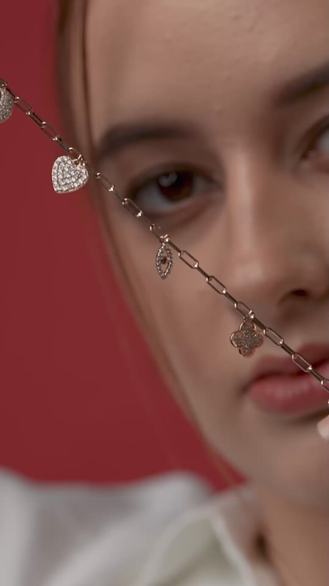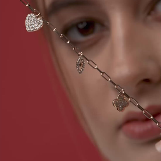 Chic 18k gold vermeil charm bracelet featuring pavé-set symbols including a crescent moon, heart, clover, and eye designs.