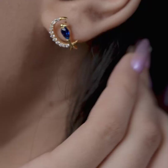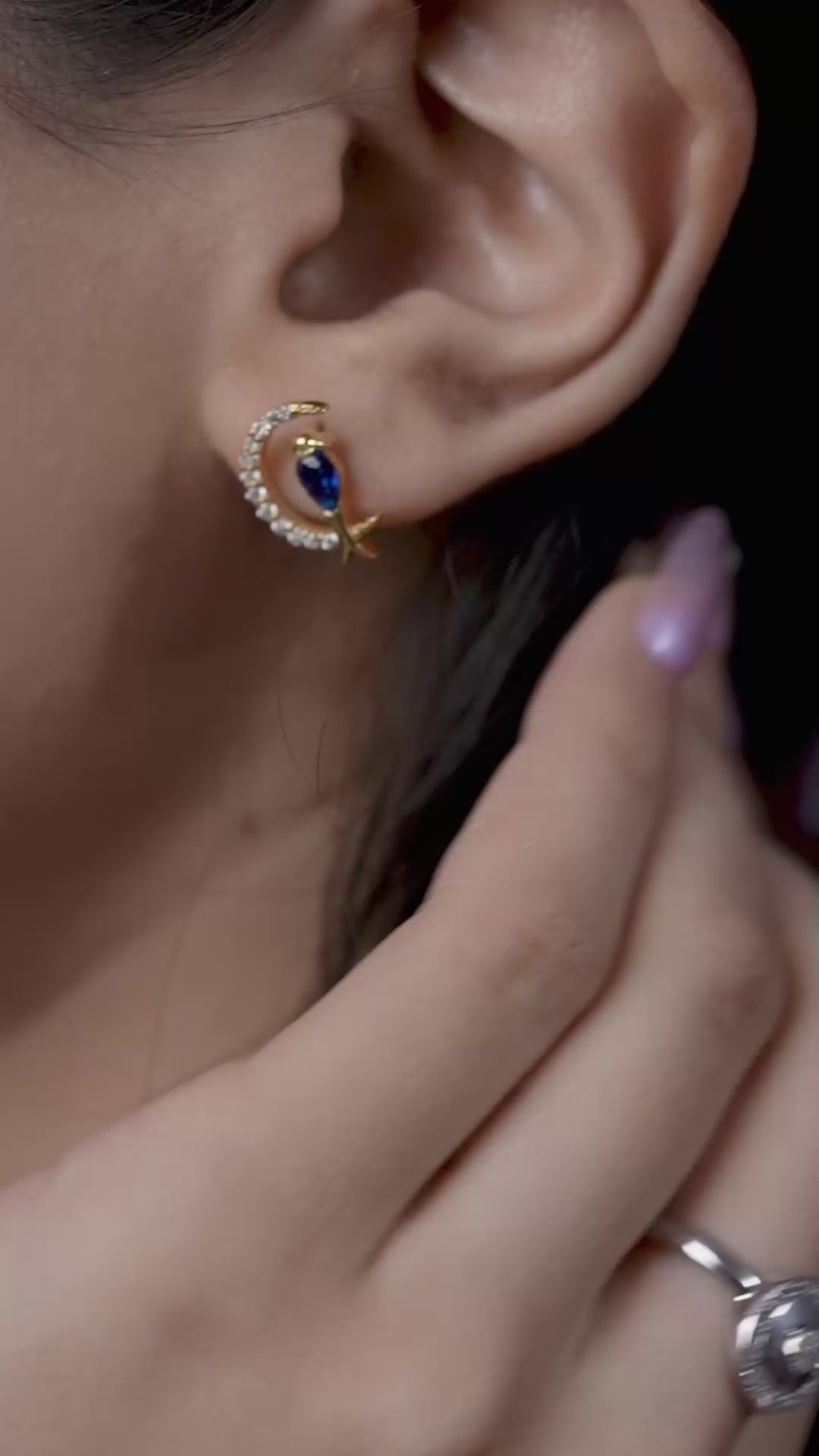 Carry a touch of whimsy and wonder with you wherever you go with these enchanting earrings. The design features a sparkling crescent moon lined with pavé crystals, sheltering a delicate bird motif with a deep blue gemstone body. Crafted in 18K gold vermeil on 925 sterling silver, they are anti-tarnish and hypoallergenic, making them a safe and comfortable choice for sensitive ears. Whether you are adding a playful detail to your office attire or looking for a cute accessory for a weekend outing, these lightweight studs bring a magical charm to the modern Indian woman’s collection.