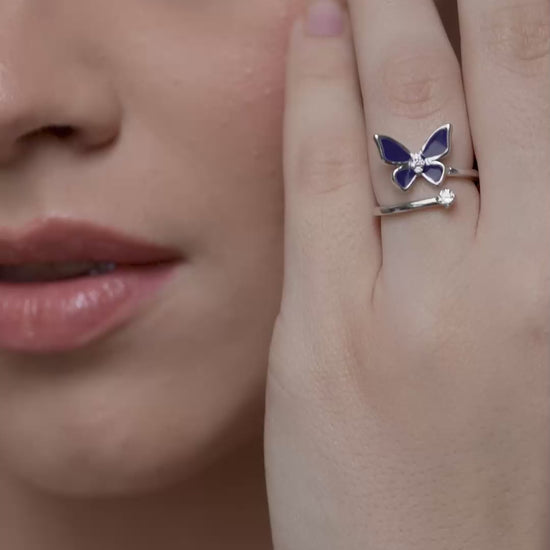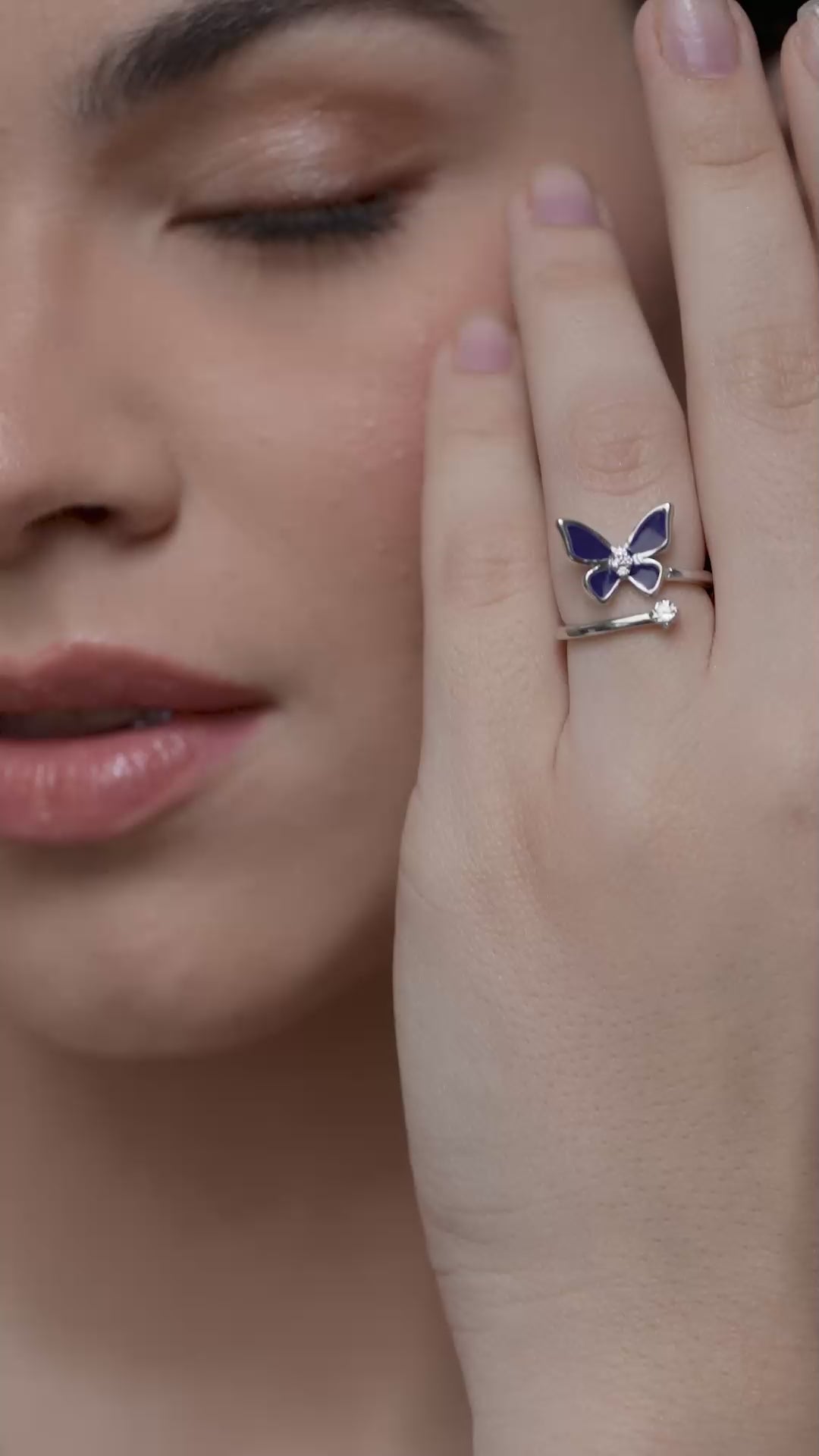 Make a vibrant statement with this striking wrap ring, showcasing a detailed butterfly motif filled with rich, dark blue enamel. The butterfly’s body shimmers with delicate pave accents, while the open band curls around to meet a brilliant solitaire stone. Crafted in 18K gold vermeil on 925 sterling silver, this anti-tarnish and hypoallergenic piece is safe for sensitive skin, making it a comfortable choice for long events. This unique design adds a bold pop of colour and elegance, making it an ideal accessory for special occasions, cocktail parties, or simply elevating your everyday style.