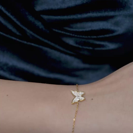 This is a dainty gold bracelet featuring a single butterfly charm at its center.
