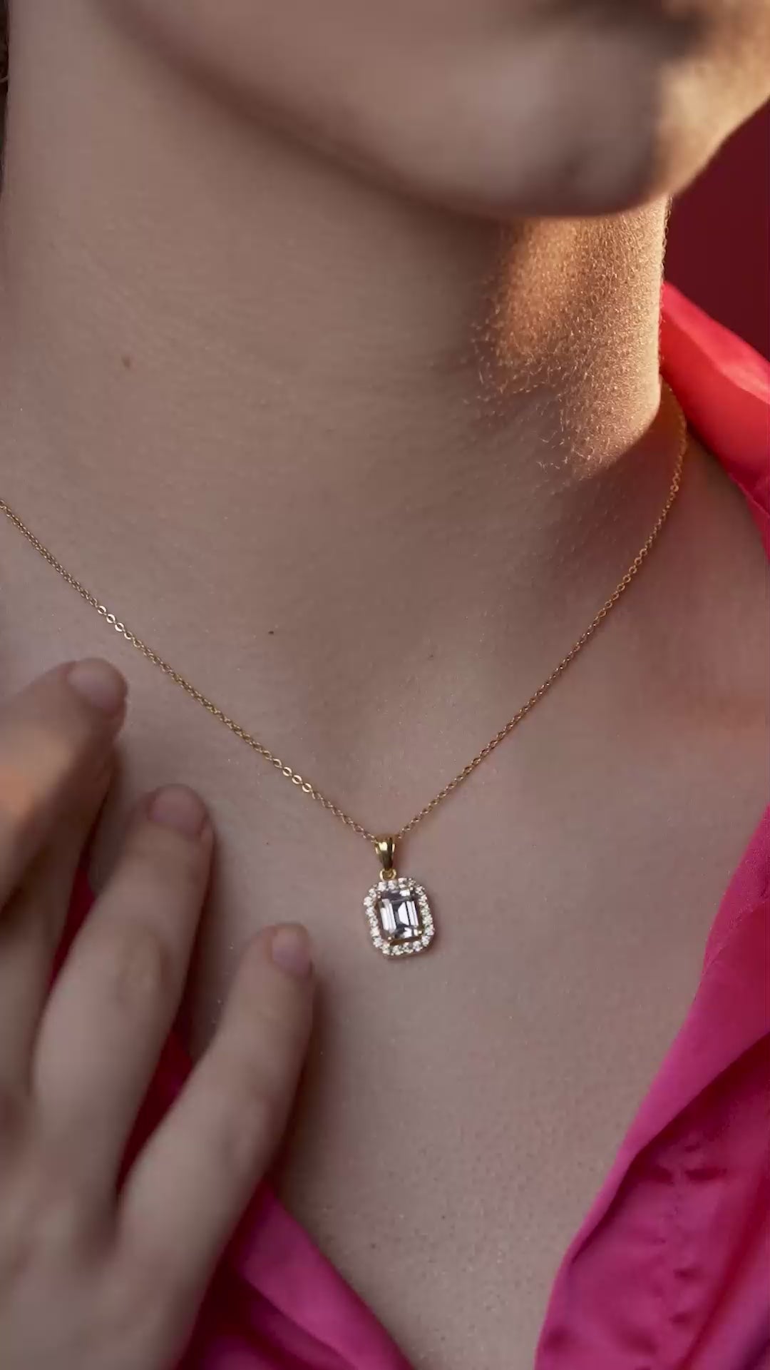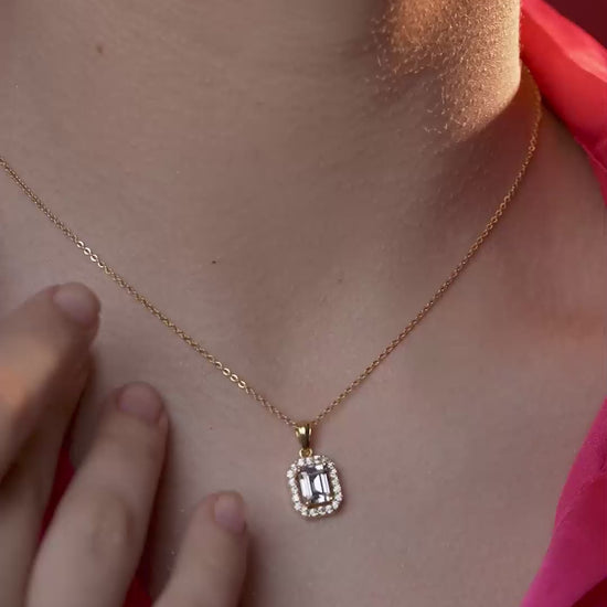 Channel timeless sophistication with this exquisite design. The pendant features a pristine emerald-cut center stone surrounded by a brilliant halo of smaller accents, creating a look of understated luxury that mimics fine diamond jewellery. Crafted in 18K gold vermeil on 925 sterling silver, it is anti-tarnish and hypoallergenic, ensuring it remains safe and comfortable for sensitive skin. A wardrobe essential for the modern Indian woman, this lightweight necklace adds a refined touch to business suits or elevates a simple evening saree.