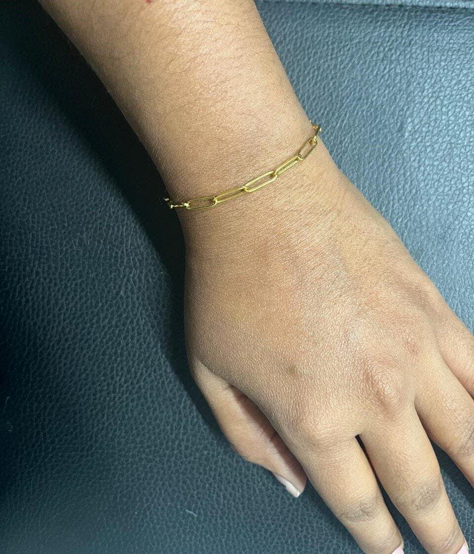 Master the art of layering with this versatile chain bracelet. Featuring sleek, elongated rectangular links in a high-polish finish, the paperclip design offers a modern, airy aesthetic that looks just as good worn solo as it does stacked with your favourite watch or cuffs. Crafted in 18K gold vermeil on 925 sterling silver, it is anti-tarnish and hypoallergenic, ensuring it stays bright and comfortable on sensitive skin. Whether you are dressing for a corporate meeting or a casual weekend brunch, this lightweight staple is the ultimate go-to for the trendy Indian woman.