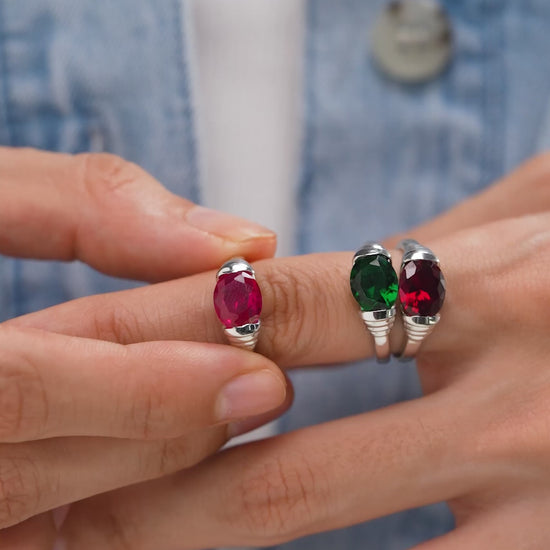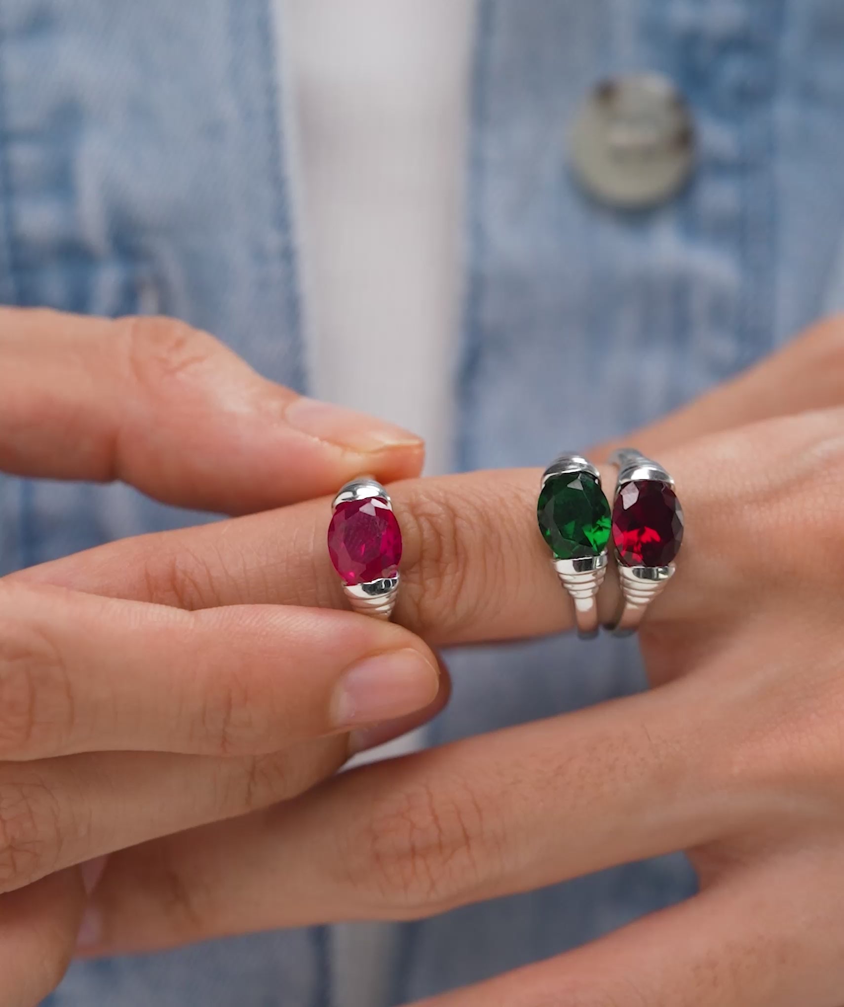 Vibrant silver-tone statement rings featuring bold oval-cut gemstones in deep red and green hues.