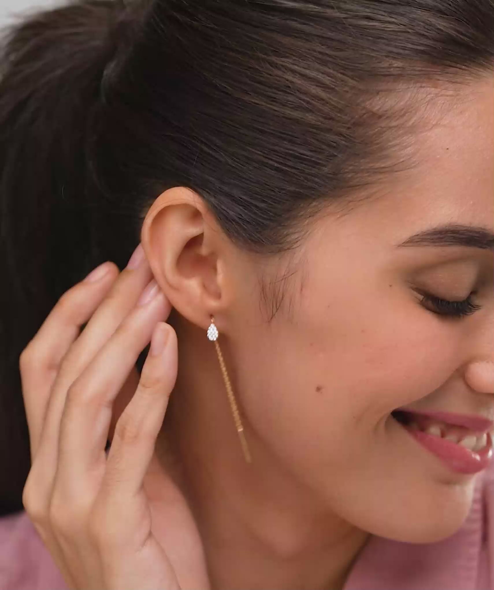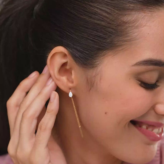 Introduce a sense of fluid movement to your style with these graceful chain earrings. The design highlights a sparkling, pavé-set teardrop that sits elegantly on the ear, connected to a fine chain that sways gently with every turn of your head. A modern take on the classic 'sui dhaga' style, these are crafted in 18K gold vermeil on 925 sterling silver, offering an anti-tarnish and hypoallergenic solution for sensitive skin. Lightweight and effortlessly chic, they are the perfect accessory for Indian women looking to add a sophisticated touch of drama to a dinner date or a festive celebration.