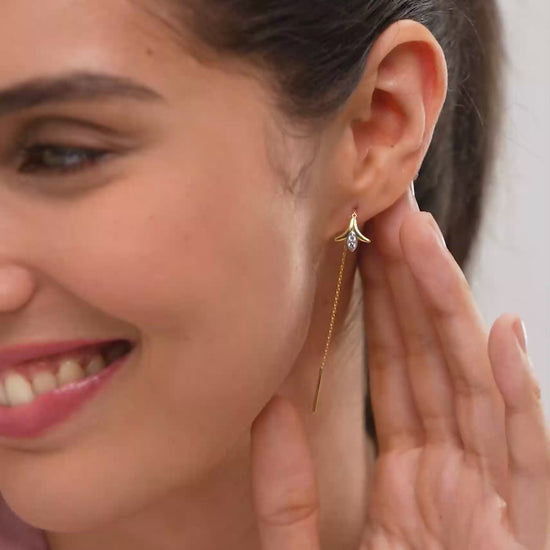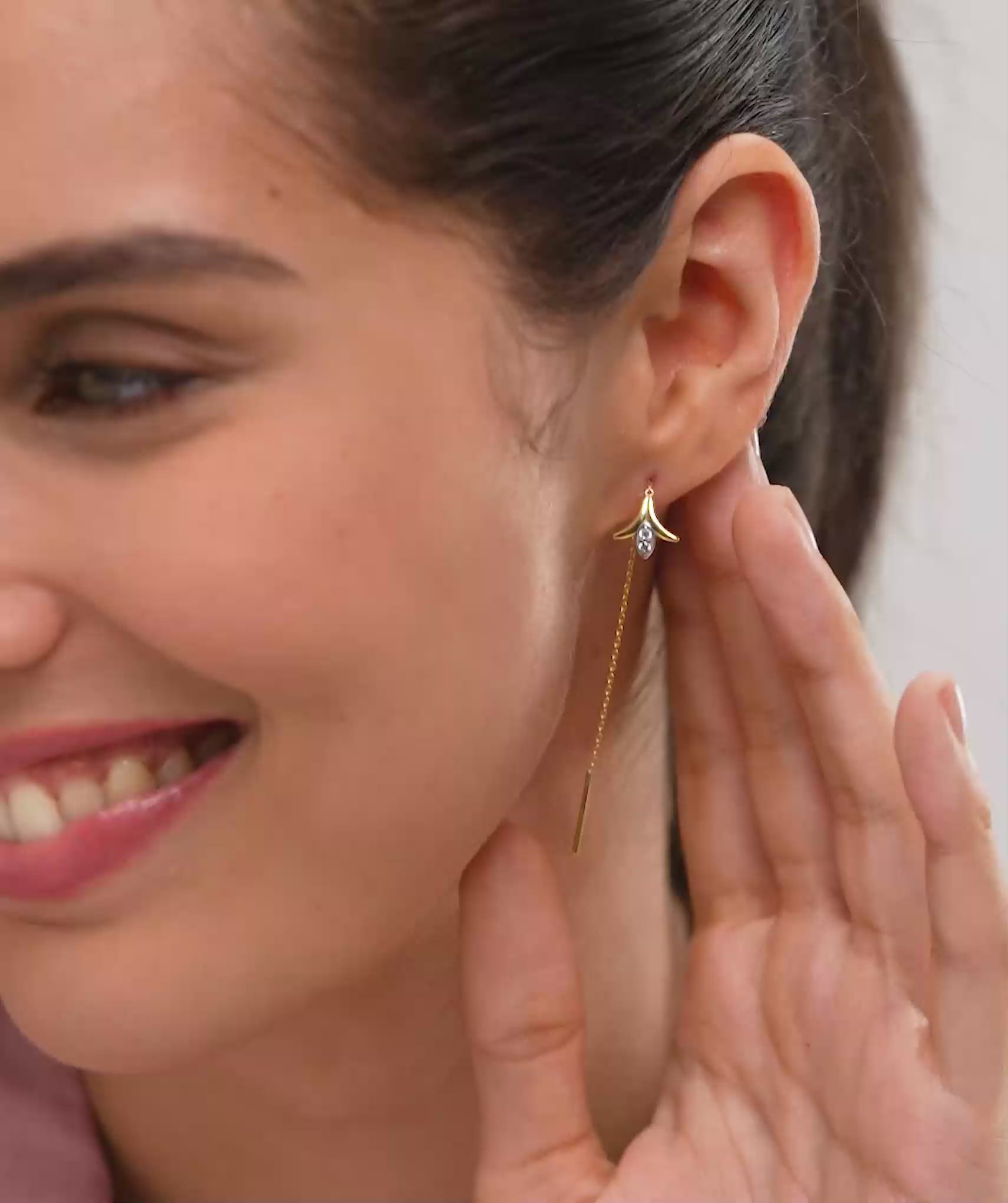 Sway with the gentle elegance of these floral-inspired threaders. The design features a petite, three-petaled tulip motif cradling a central crystal, suspended from a fine chain that threads effortlessly through the ear. A contemporary update to the traditional 'sui dhaga', this pair is crafted in 18K gold vermeil on 925 sterling silver, ensuring it is anti-tarnish and hypoallergenic for sensitive skin. Lightweight and romantic, they are the perfect accessory for the modern Indian woman, adding a graceful finish to a flowing maxi dress or a festive saree.