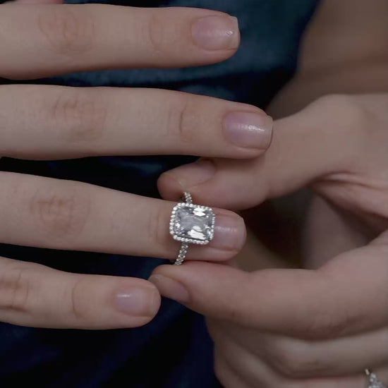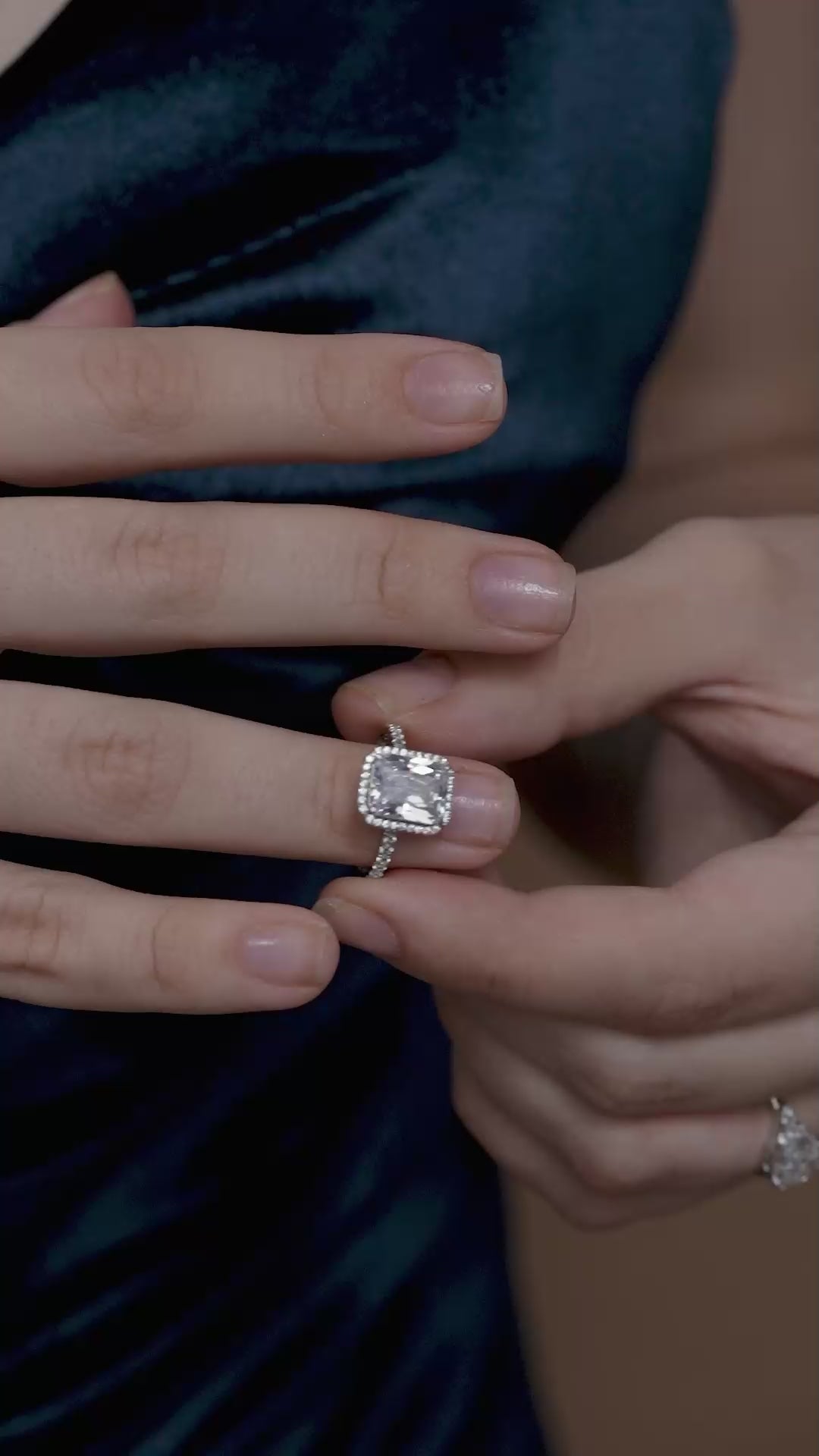 This is a gold ring featuring a radiant-cut diamond at its center, surrounded by a halo of smaller diamonds.