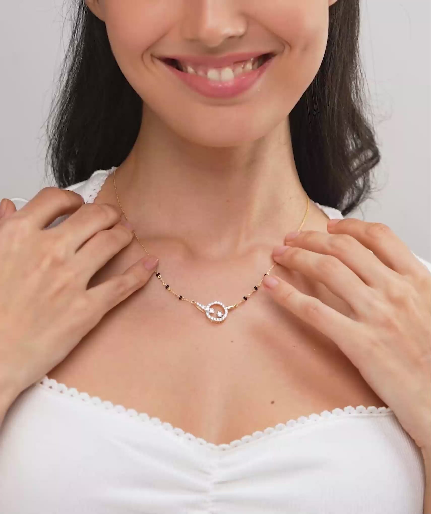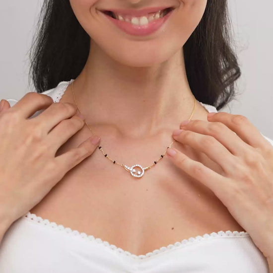 This 18K gold vermeil necklace features a contemporary circular pendant encrusted with shimmering stones. The sleek design is paired with a black beaded chain, blending modern minimalism with traditional charm.