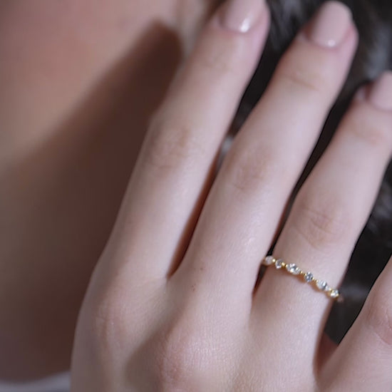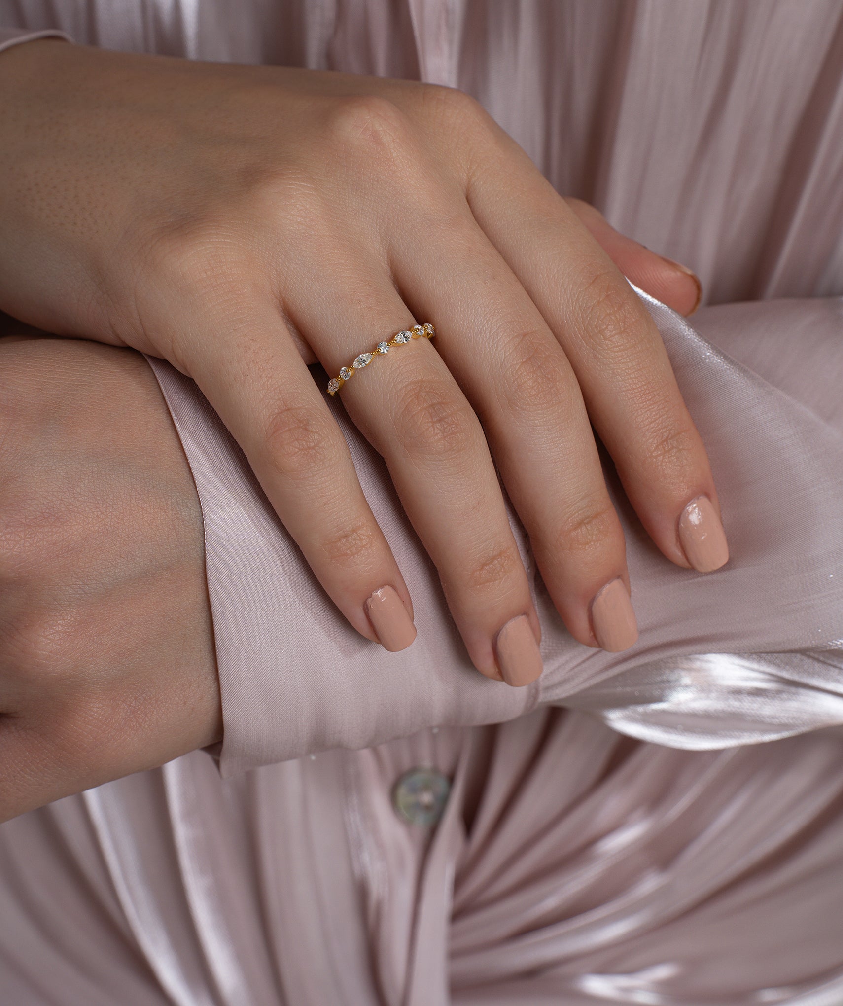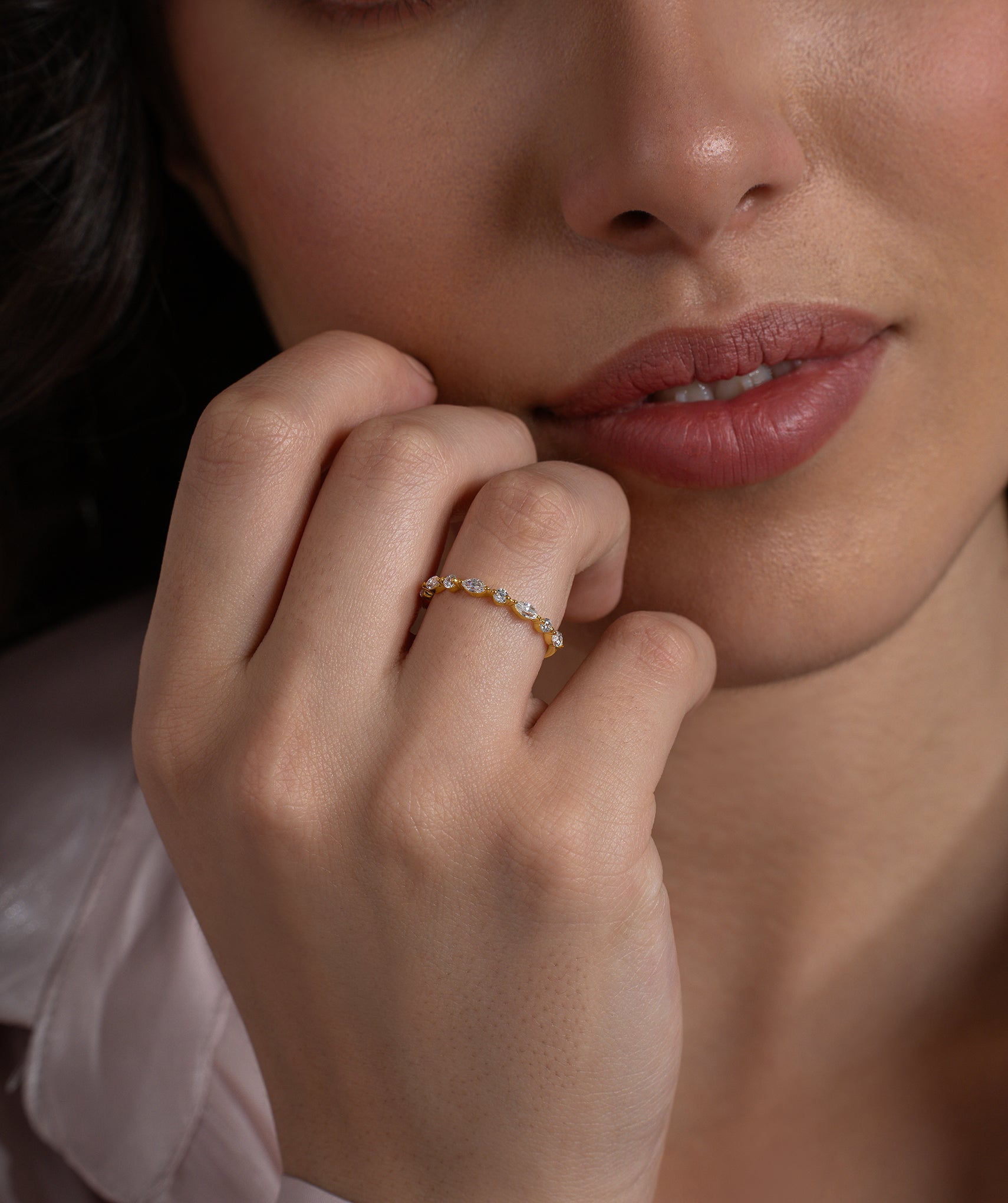 Add a touch of elegant sparkle to your look with this delicate stacking band, featuring an alternating row of brilliant round and marquise-cut stones for a unique, sophisticated design. This refined ring is an excellent choice for modern Indian women looking for a subtle yet statement-making piece for daily wear, date nights, or even office parties. Crafted in premium 18K gold vermeil on 925 sterling silver, it offers a luxurious gold feel while being anti tarnish and completely hypoallergenic, ensuring it is gentle on sensitive skin and comfortable to wear for long periods. This lightweight, stylish gold ring is perfect for stacking with other bands or wearing solo for a minimal, trendy look.