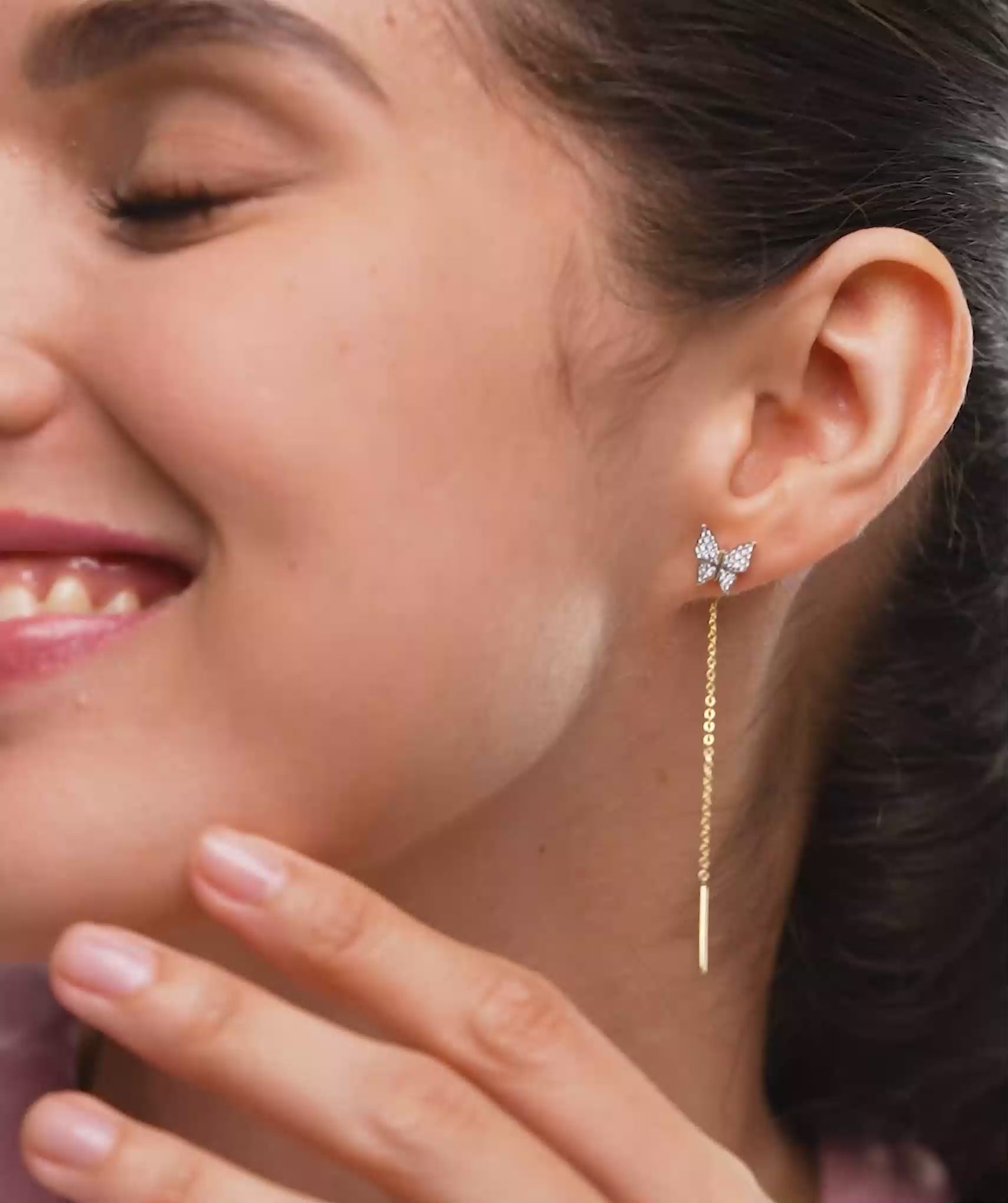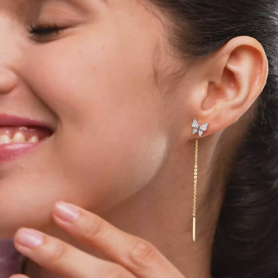 These are delicate gold butterfly threader earrings, featuring sparkling diamond accents on the butterfly wings.
