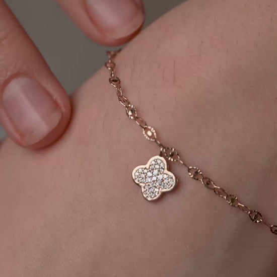 This is a gold bracelet featuring a textured rope-style chain and a diamond-studded four-leaf clover charm.
