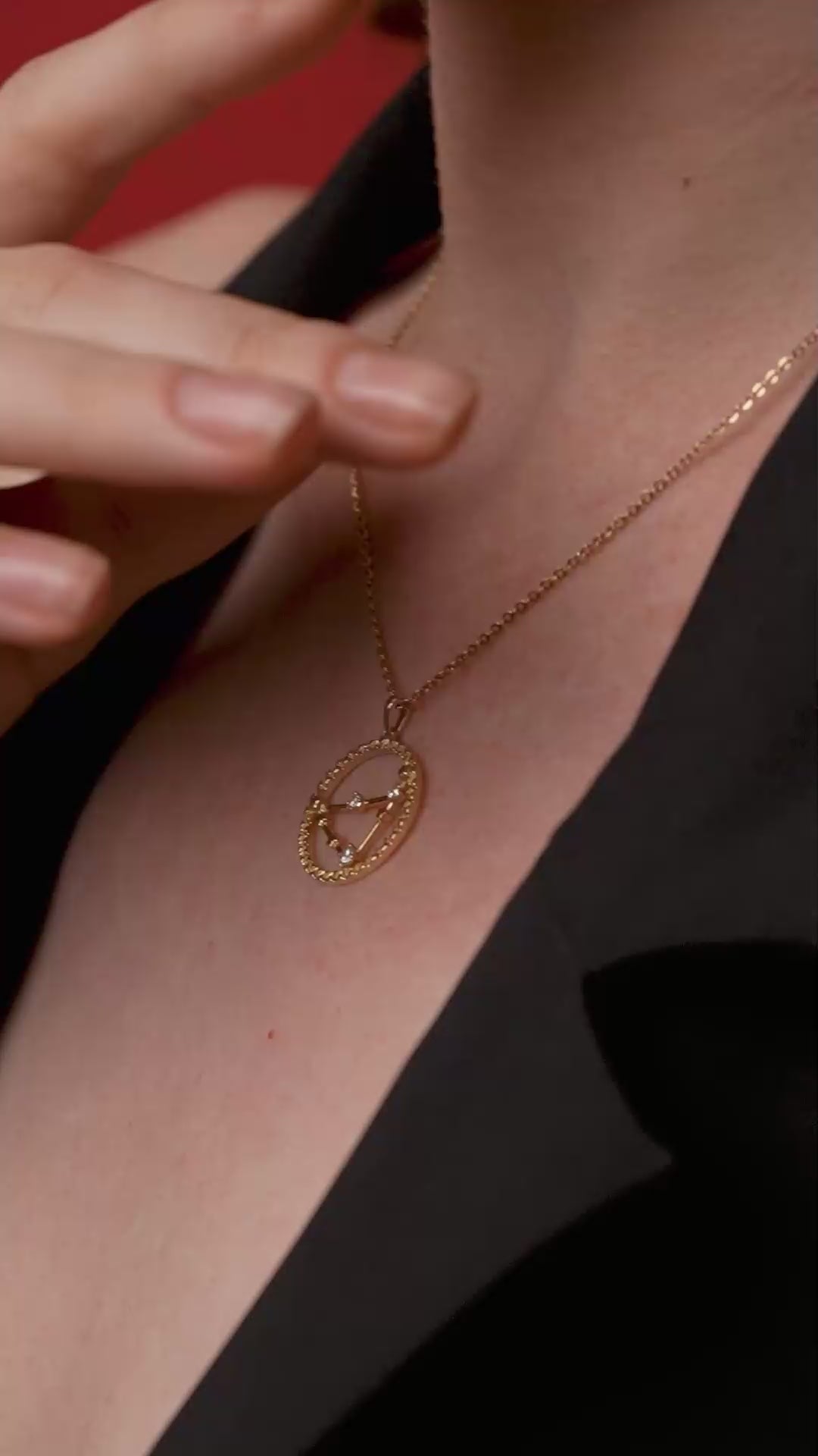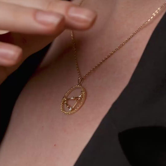 This elegant 18k Gold Vermeil constellation necklace features a delicate zodiac design adorned with shimmering stones.