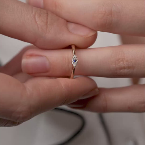 An 18k gold vermeil ring featuring a marquise-shaped pavé design with a striking blue center stone for a touch of timeless charm.