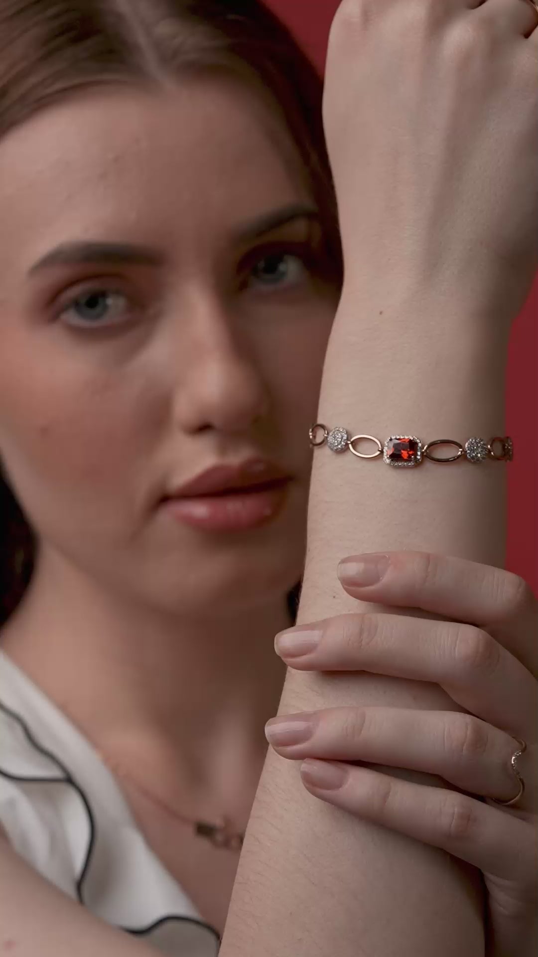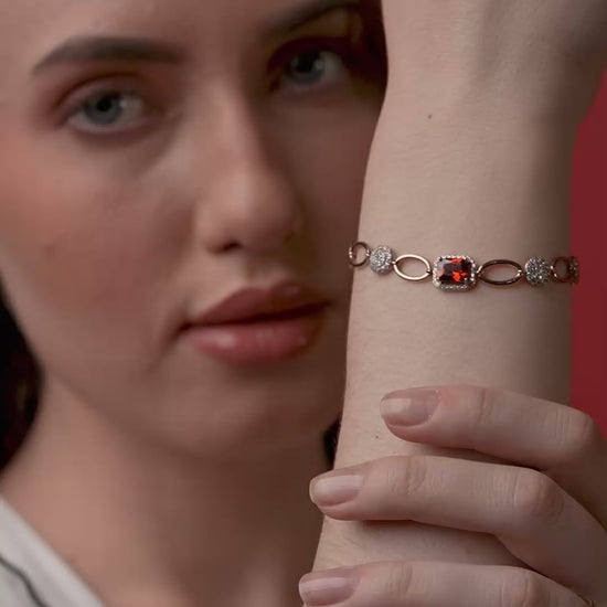 Refined 18k gold vermeil bracelet showcasing a striking red gemstone at its center, framed by pavé crystal spheres and delicate oval links.