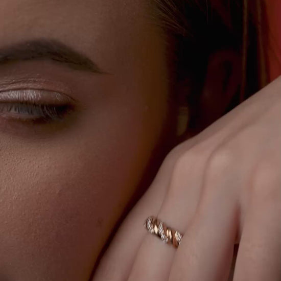 A sleek 18k gold vermeil eternity ring featuring alternating baguette and round diamonds, creating a sophisticated and modern design.
