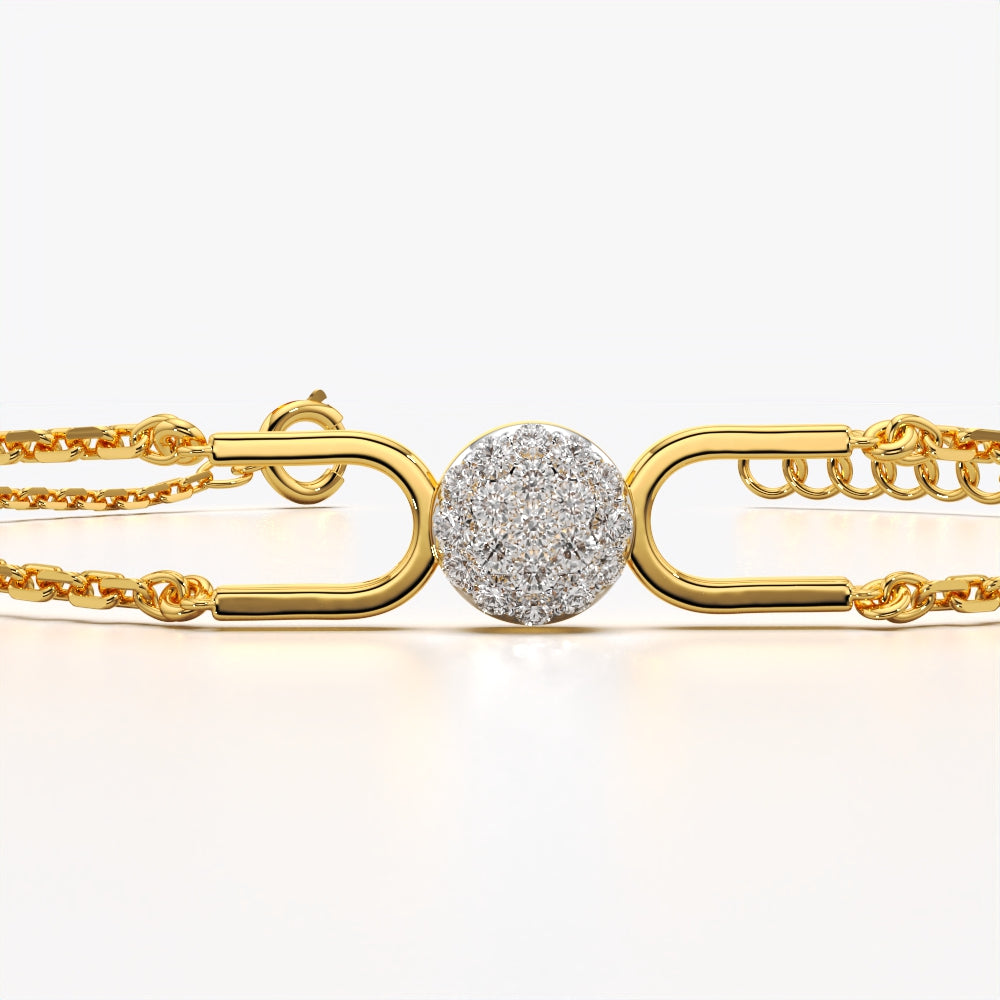 Master the layered look effortlessly with this sophisticated chain bracelet. The design features a brilliant pavé-set circle at its core, connected by sleek elongated gold loops to a delicate double chain, creating a structured yet airy silhouette. Crafted in 18K gold vermeil on 925 sterling silver, it is anti-tarnish and hypoallergenic, ensuring it feels lightweight and comfortable on sensitive skin. Whether pairing it with a professional blazer or a casual kurti, this piece adds a refined, modern touch to the everyday Indian woman's wardrobe.