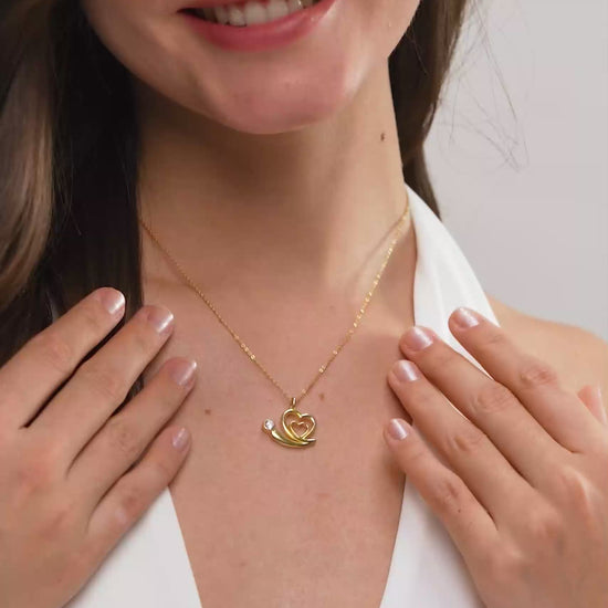 A graceful 18k gold vermeil necklace featuring two interlocked hearts and a single sparkling stone—a symbol of layered love.