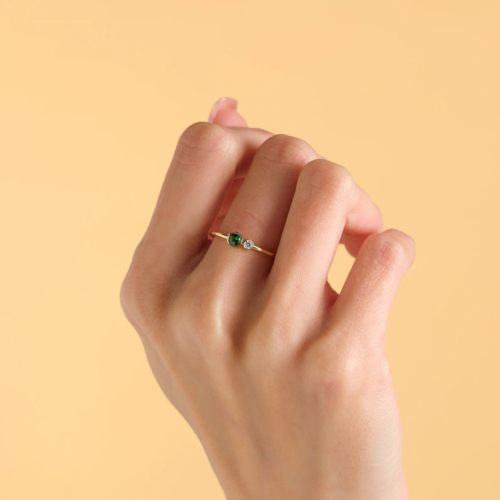 Add a touch of intentional color and modern minimalism to your everyday ensemble with this Dual Bezel Gemstone Ring, a chic piece of Everyday Gold for the contemporary Indian woman. The ring features a sleek, comfortable band that showcases two perfectly round, bezel-set stones: one brilliant white, and one vibrant green, positioned side-by-side for a balanced, asymmetrical look. This unique, two-stone design is simple enough for continuous daily wear yet colorful and polished enough for sophisticated office wear or a stylish afternoon brunch. Crafted in premium 18K gold vermeil on 925 sterling silver, this piece is completely anti tarnish and hypoallergenic, offering skin-friendly comfort and enduring warmth that aligns perfectly with your calm and elegant aesthetic.