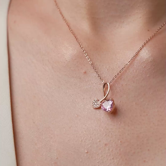A charming 18k gold vermeil necklace featuring intertwined hearts, one with pavé diamonds and the other with a pink heart-shaped gemstone, symbolizing love and connection.
