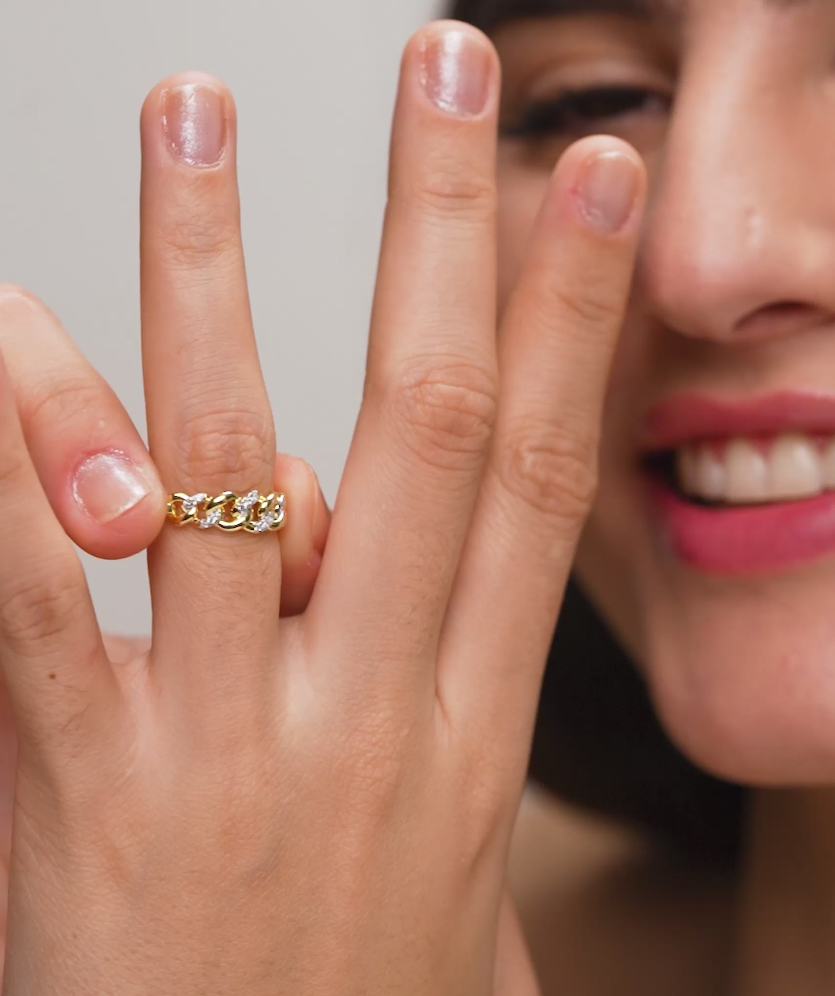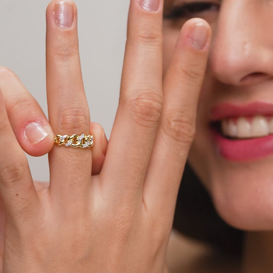 This is a gold chain-link diamond ring featuring an interwoven design that blends polished yellow gold links with pavé-set diamonds.