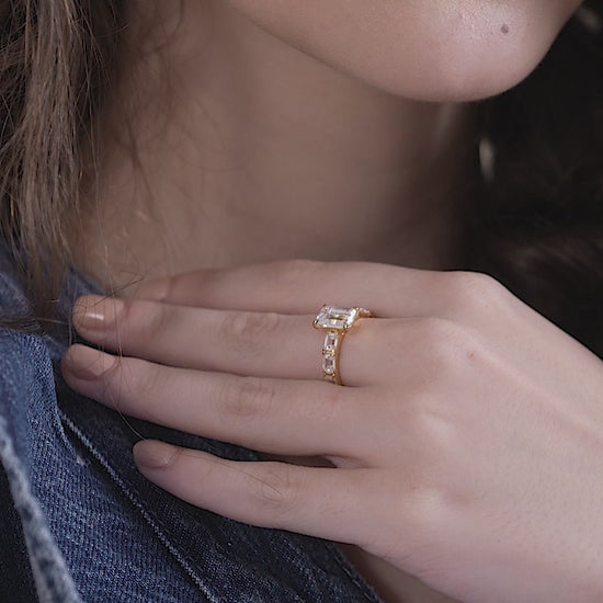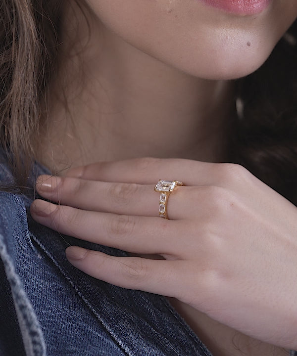Master the art of sophisticated sparkle with this Emerald Cut Solitaire & Baguette Band Ring. A tribute to modern geometry, this stunning piece features a pristine emerald-cut centre stone that commands attention, resting on a luxurious band lined with shimmering baguette-cut crystals. The result is a continuous "hall of mirrors" effect that exudes Art Deco glamour with a contemporary edge. Crafted in 18K gold vermeil on 925 sterling silver, it is anti-tarnish and hypoallergenic, ensuring a comfortable wear for sensitive skin. Ideally suited for the confident Indian woman, this ring makes a bold power statement at office events or serves as a breathtaking accessory for festive parties.