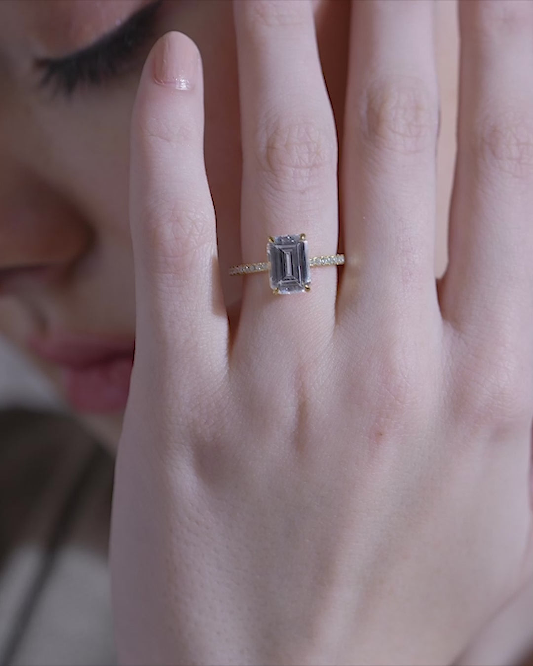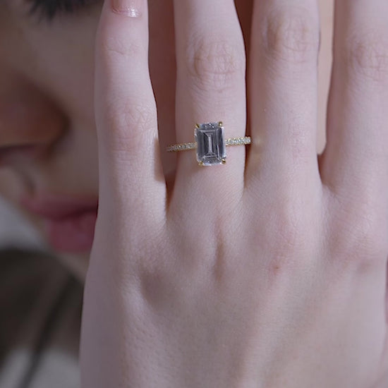 Add a touch of glamour to your hand with this stunning solitaire ring, designed to catch the light from every angle. It features a prominent emerald-cut stone set vertically on a delicate band paved with shimmering accents, creating a classic yet radiant look. Crafted in 18K gold vermeil on 925 sterling silver, it offers the rich finish of gold while being anti-tarnish and hypoallergenic for sensitive skin. This piece is perfect for modern Indian women looking for a sophisticated accessory for festive occasions, cocktail parties, or simply to elevate a workday outfit with some serious sparkle.