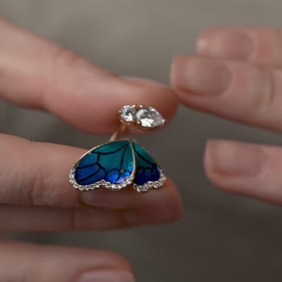 Make a stunning, modern statement with this truly unique Enamel Butterfly Open Ring, designed for the bold Indian woman who embraces expressive, trendy, and intentional jewelry. This captivating adjustable ring features a large, detailed butterfly wing beautifully crafted with vibrant blue enamel and pavé borders, balanced by a brilliant marquise and pear-cut stone cluster on the open end. Crafted in high-quality 18K gold vermeil on 925 sterling silver, it is reliably anti tarnish and hypoallergenic, ensuring comfortable wear despite its bold size. This striking, modern piece is perfect for transforming office wear, making an artistic impact at brunch, or dazzling as statement party wear, showcasing your unique, fashion-forward lifestyle.
