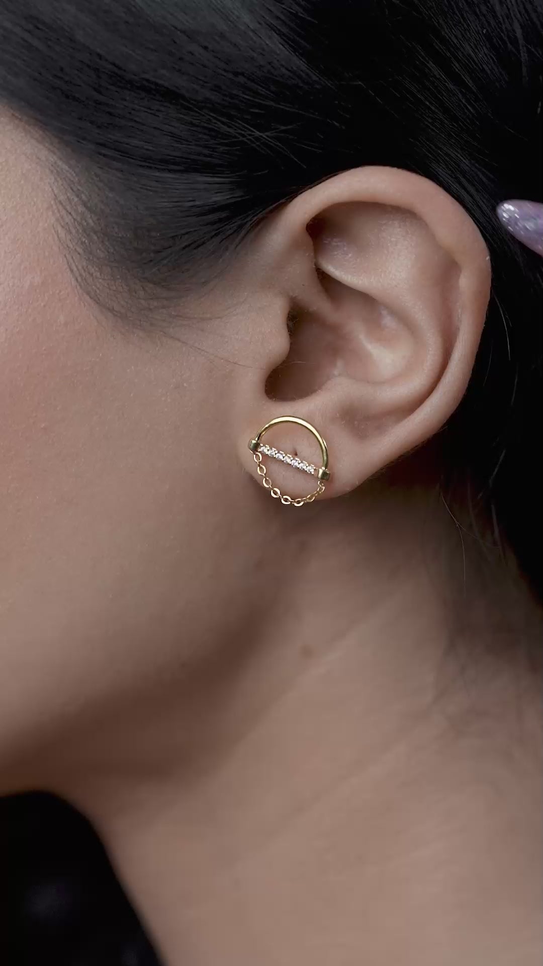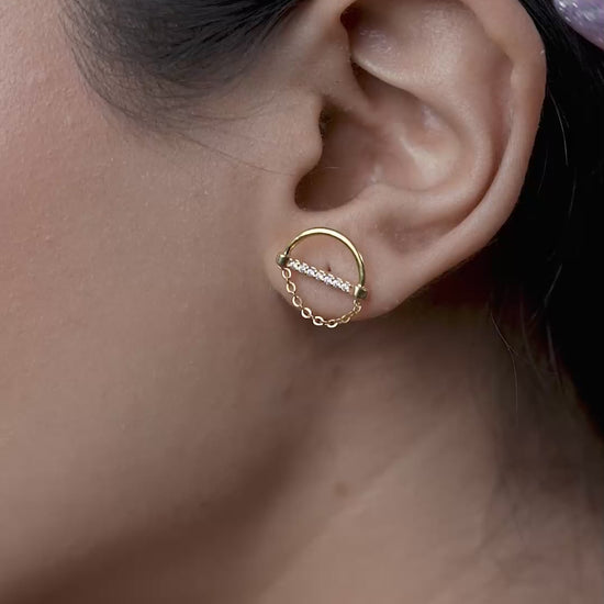These are modern geometric stud earrings featuring a semi-circle gold frame accented by a horizontal diamond bar and a delicate chain detail.