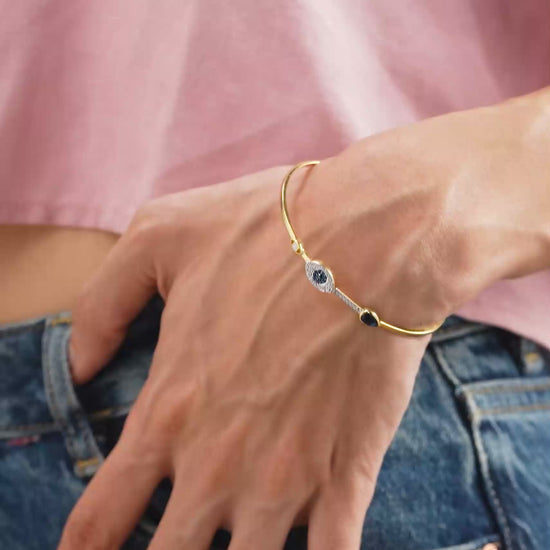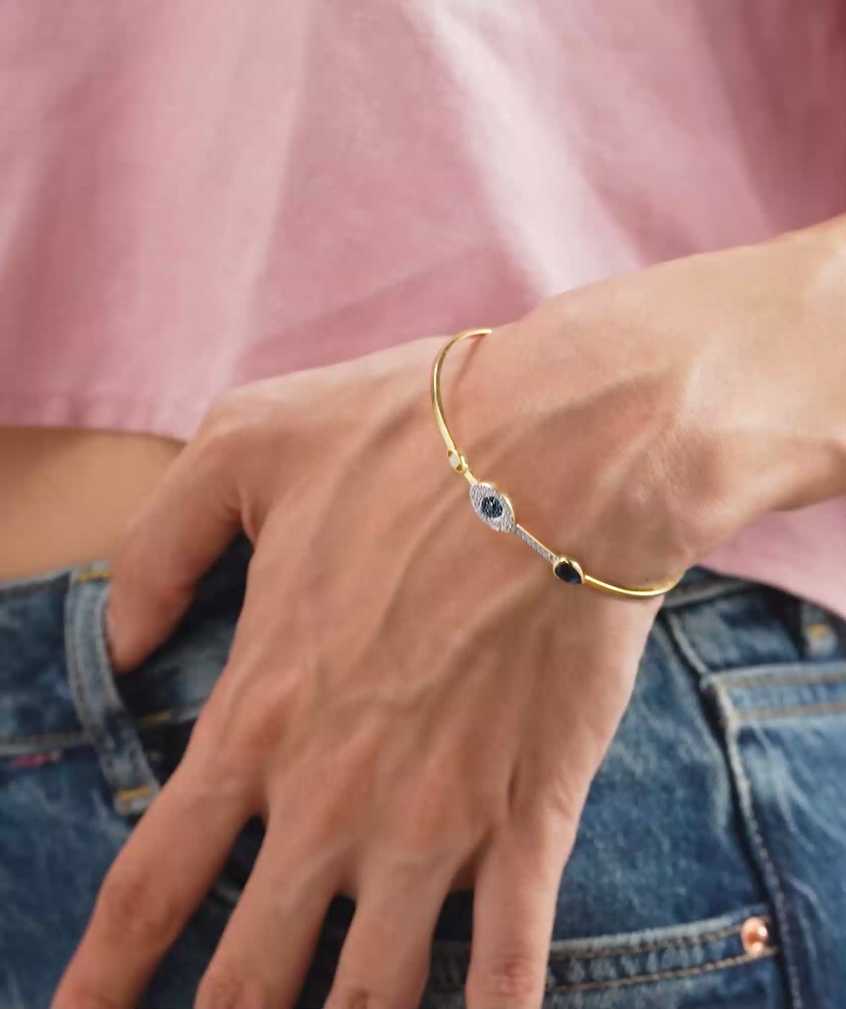 This is a gold bangle bracelet featuring an evil eye motif at its center, adorned with pavé-set white and blue stones.