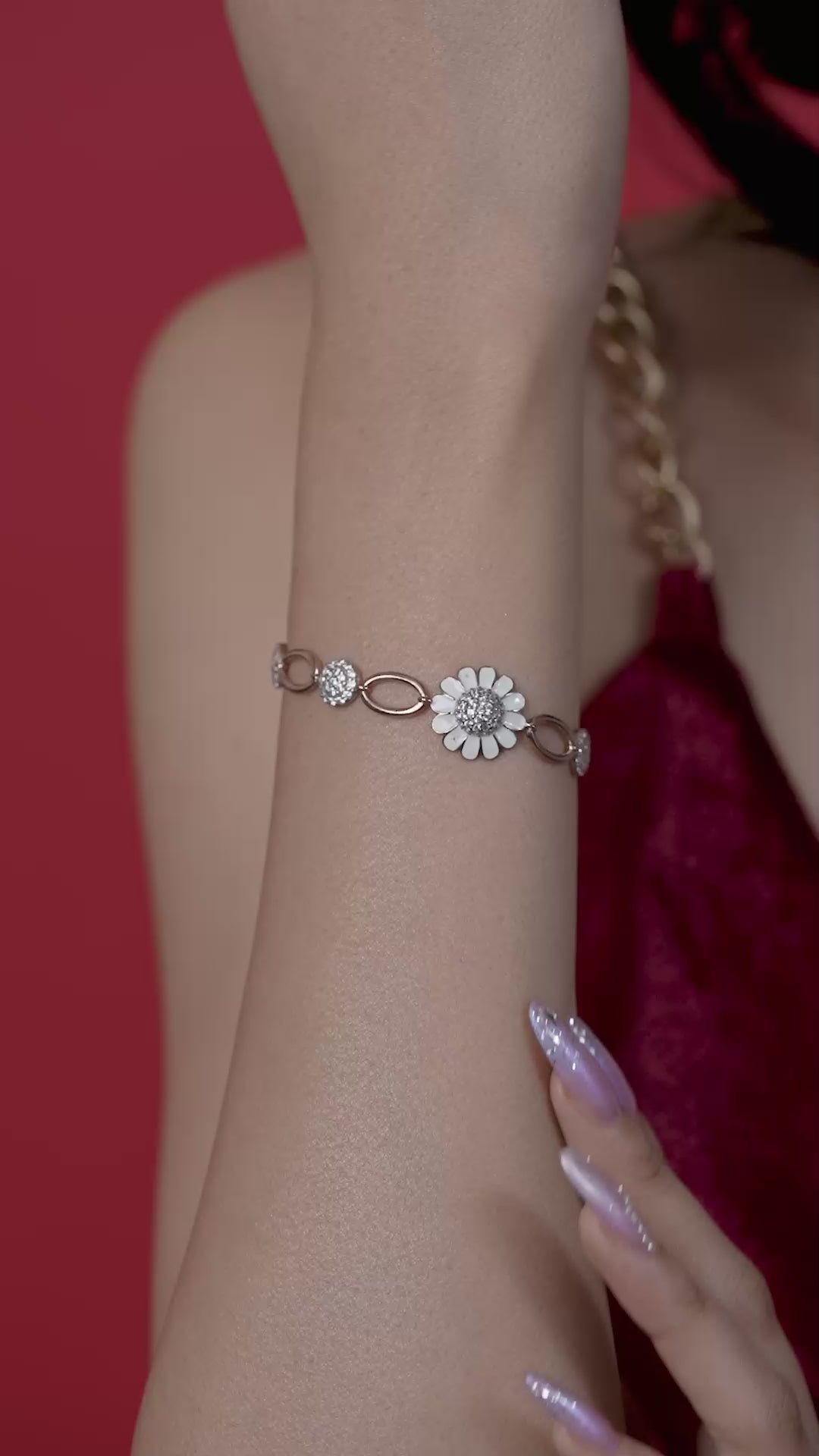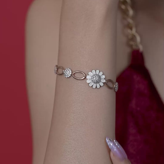 Charming 18k gold vermeil bracelet adorned with a delicate enamel daisy centerpiece, surrounded by pavé crystal accents and oval links.