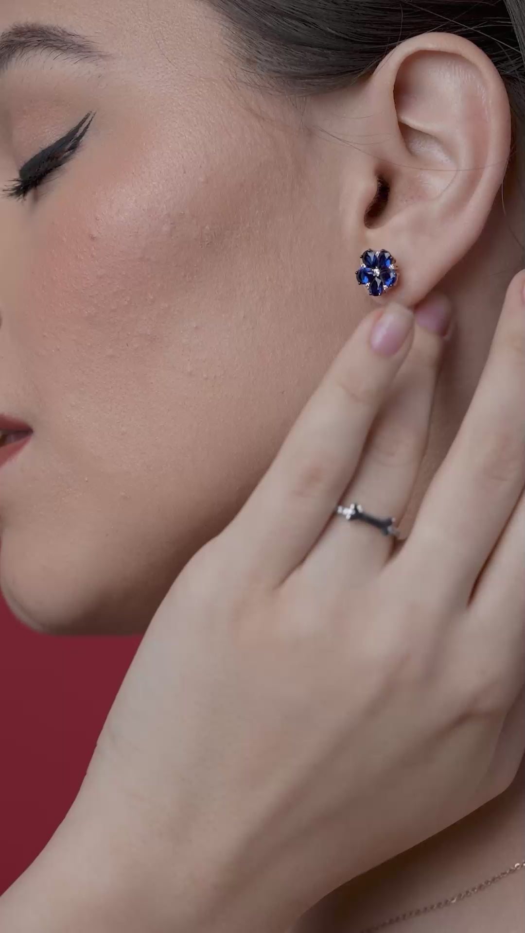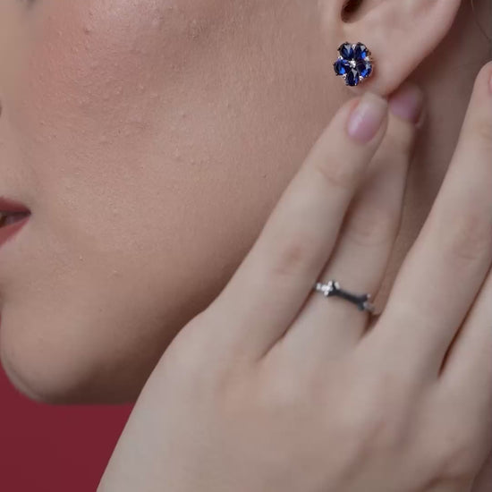 These exquisite 18k Gold Vermeil stud earrings feature a floral design with vibrant pear-cut blue gemstones, accented by delicate diamonds.