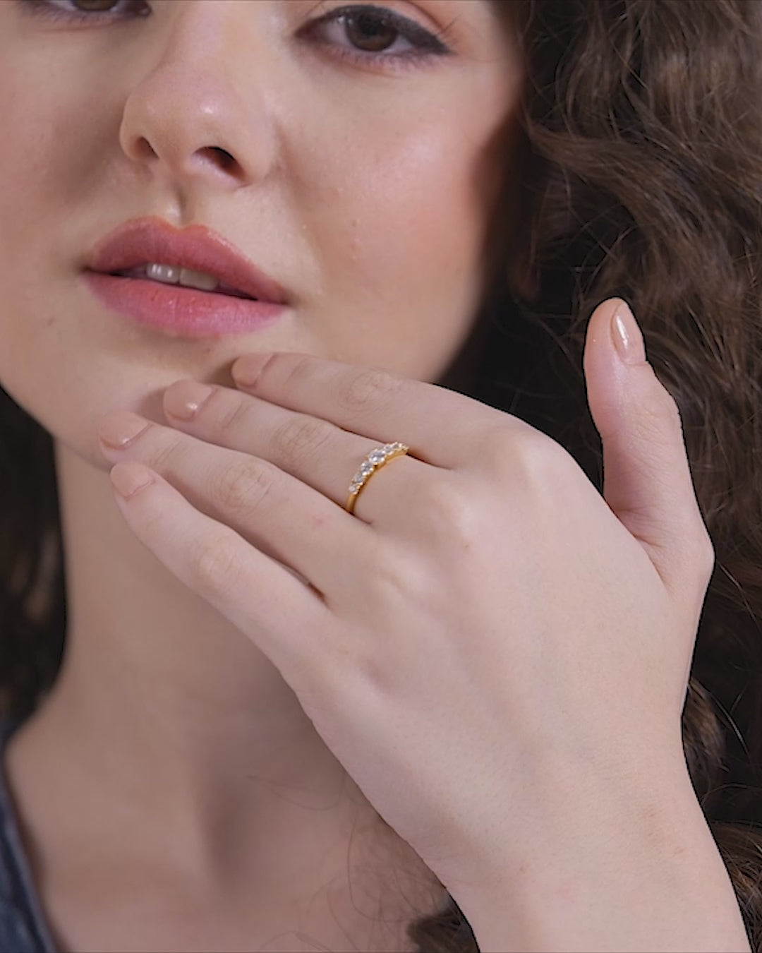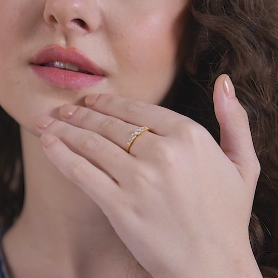 Elevate your everyday style with this charming curved graduated stone ring, featuring a delicate line of round-cut sparkling stones that gracefully taper outwards from the centre. This minimal yet radiant design is perfect for the modern Indian woman who desires a subtle, elegant piece that transitions effortlessly from office wear to daily errands. Crafted with precision in 18K gold vermeil on 925 sterling silver, this lightweight ring is certified hypoallergenic and anti-tarnish, ensuring it is gentle on sensitive skin and comfortable for continuous, long-hour wear. It's the perfect everyday gold-look ring to add a gentle shimmer to your minimal jewellery collection.
