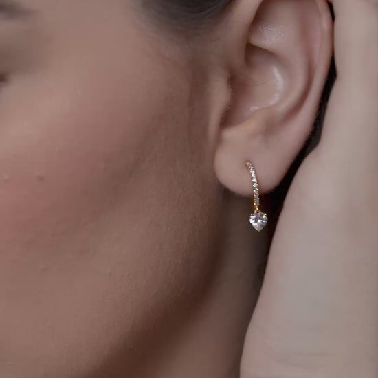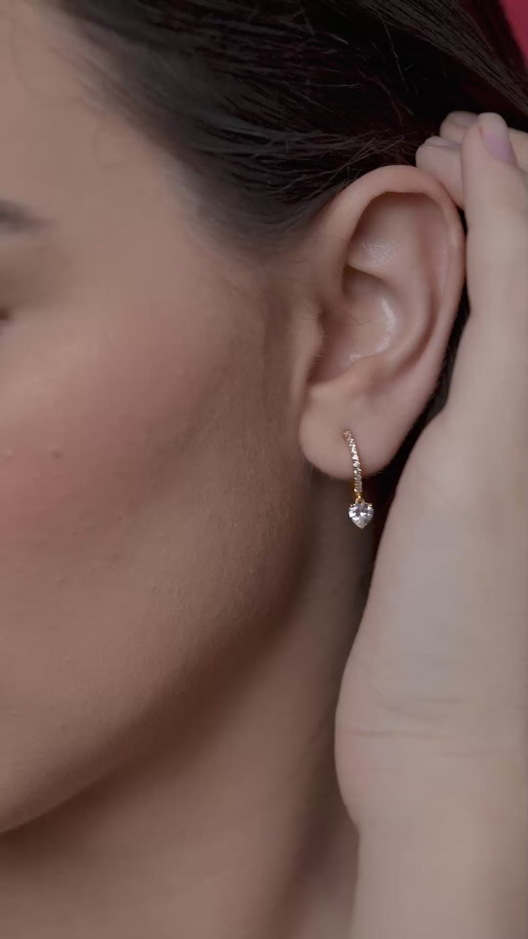 Fall in love with the classic charm and modern sparkle of these dainty huggie hoops. They feature a delicate pave-set hoop that hugs the lobe, from which a single, brilliant heart-shaped solitaire drops and moves gracefully. The secure hinged clasp ensures comfortable, reliable wear for all-day comfort. Crafted in 18K gold vermeil on 925 sterling silver, these anti-tarnish and hypoallergenic earrings are perfect for sensitive ears. They make a thoughtful gift or a romantic addition to your own collection, seamlessly transitioning from daily office wear to a special date night.