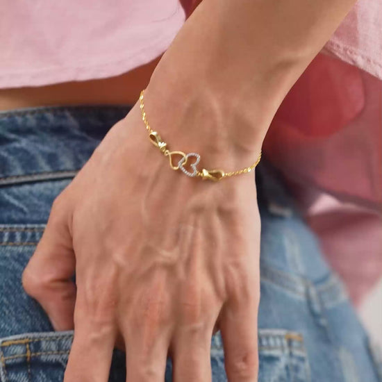 Charming 18k gold vermeil bracelet featuring two interlocking hearts — one polished gold and the other accented with pavé-set crystals.