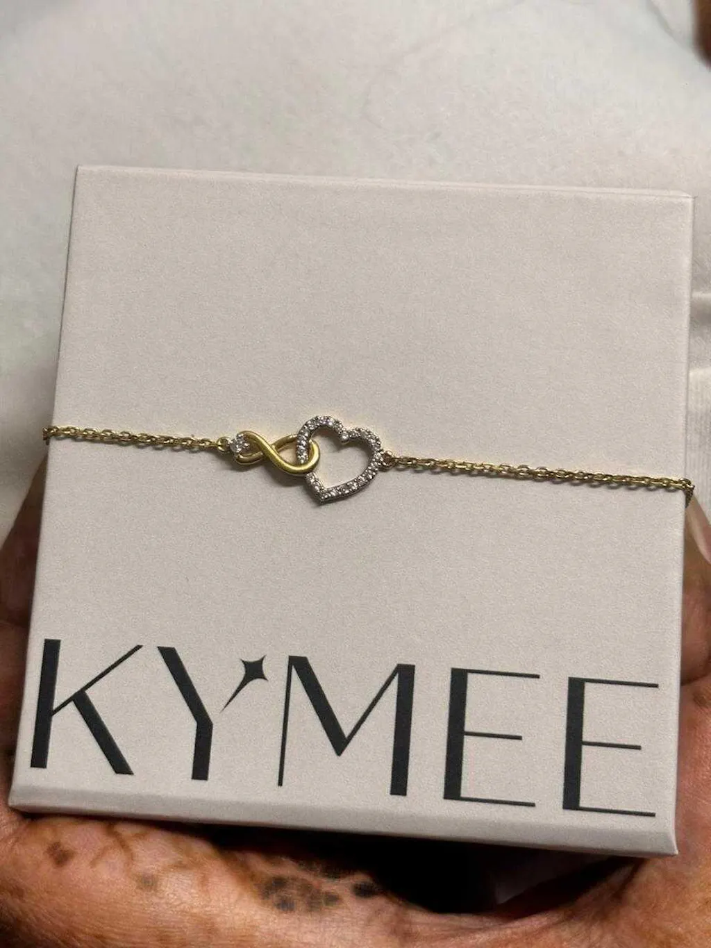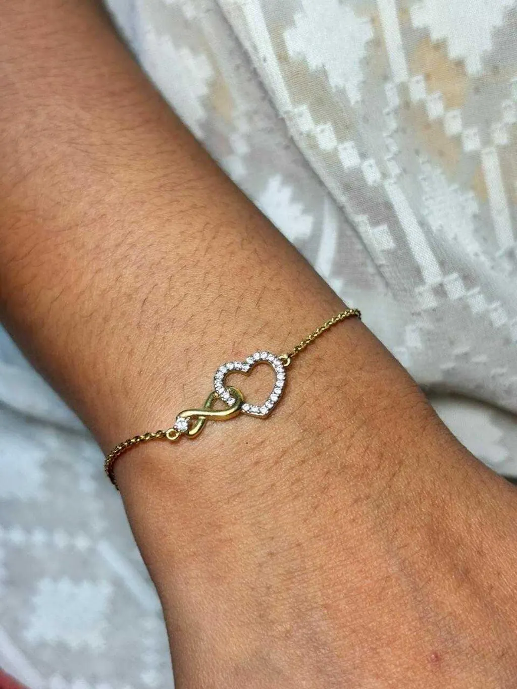 Linked Infinity & Moissanite Open Heart Chain Bracelet features a polished gold infinity symbol connected to an open heart outlined in pavé-set moissanite stones, sitting together at the centre of a fine cable-link chain in 18K gold vermeil (18K gold over 925 sterling silver). One loop of the infinity threads into the top of the heart, linking the two symbols as a single, unified motif rather than separate dangling charms. The infinity is in smooth, warm gold, while the heart sparkles in silver-toned moissanite-set detailing, creating a two-tone contrast that gives each symbol its own character while they share the same chain. The bracelet closes with a lobster clasp and includes an extension link for an adjustable fit, and the motif sits flat on the wrist for a comfortable, snag-free wear throughout the day. This bracelet pairs naturally with the Linked Infinity & Moissanite Open Heart Necklace for a coordinated set, or stands beautifully on its own alongside watches and other bracelets. The meaning is immediate and universal, love without end, making it one of the easiest, most meaningful gifts in the collection. It suits Valentine's Day, anniversaries, Mother's Day, birthdays, or any moment where you want the piece to carry a message without needing words. Nickel-free, hypoallergenic, and safe for sensitive skin.