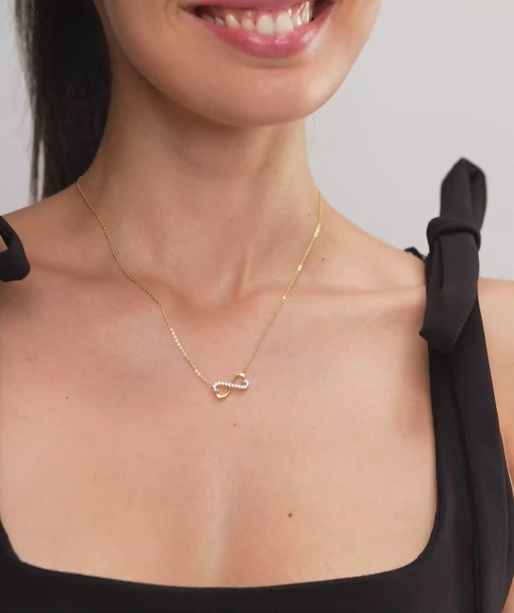 Wear a promise of forever that blends romance with modern design. This graceful necklace features an infinity symbol artfully shaped into two looping hearts, creating a beautiful contrast between smooth polished gold and a ribbon of sparkling crystals. Crafted in 18K gold vermeil on 925 sterling silver, it is anti-tarnish and hypoallergenic, ensuring it stays safe and comfortable on sensitive skin. Whether you are looking for a meaningful gift to celebrate a special bond or a delicate accessory for your daily office wear, this lightweight piece adds a touch of sentiment and shine to any outfit.