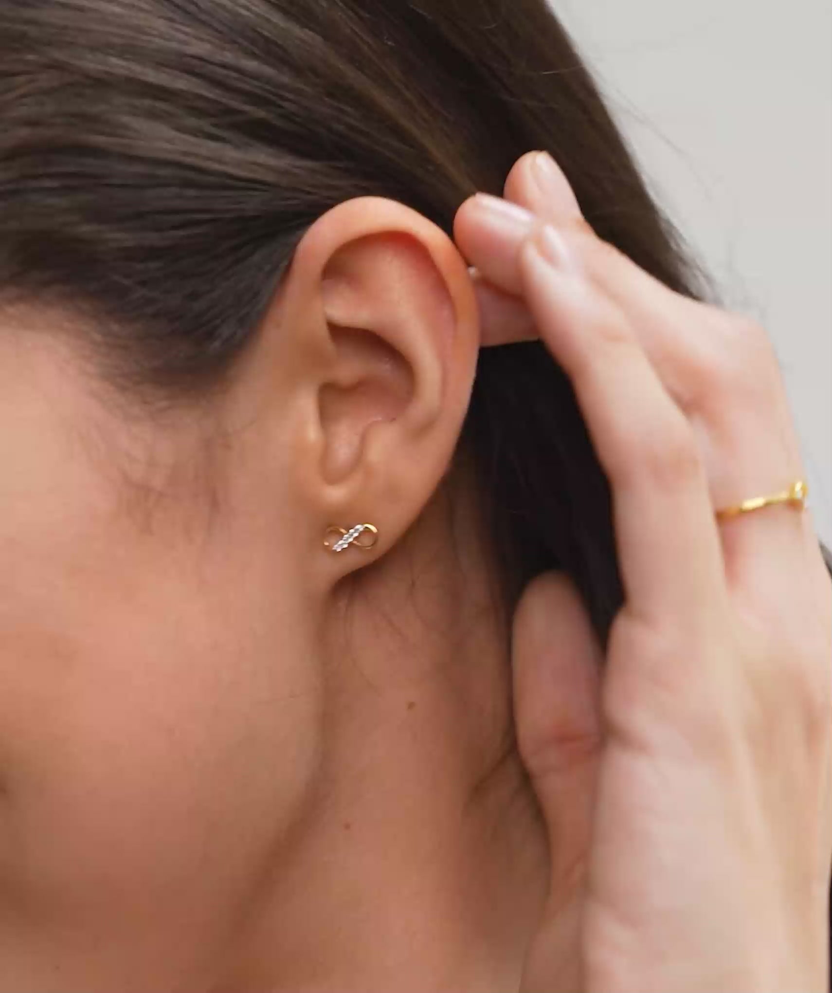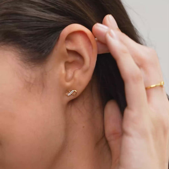 A delicate pair of infinity-shaped 18k Gold Vermeil stud earrings, adorned with sparkling diamonds for a timeless look.