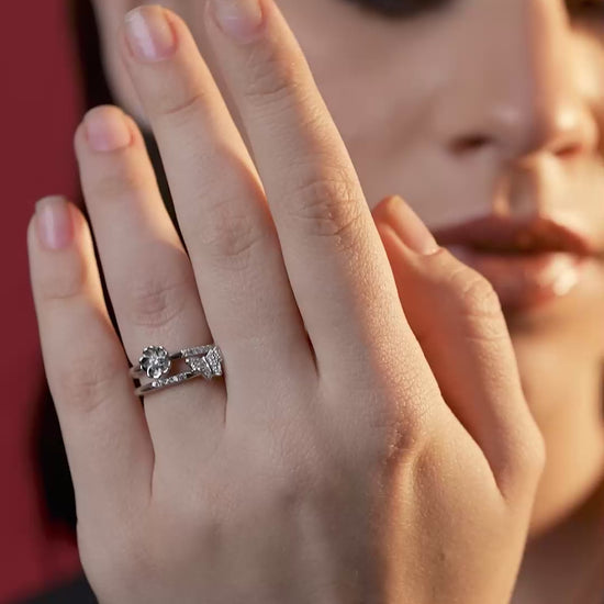 This is a gold open ring featuring a charming butterfly motif on one end and a sparkling diamond accent on the other.