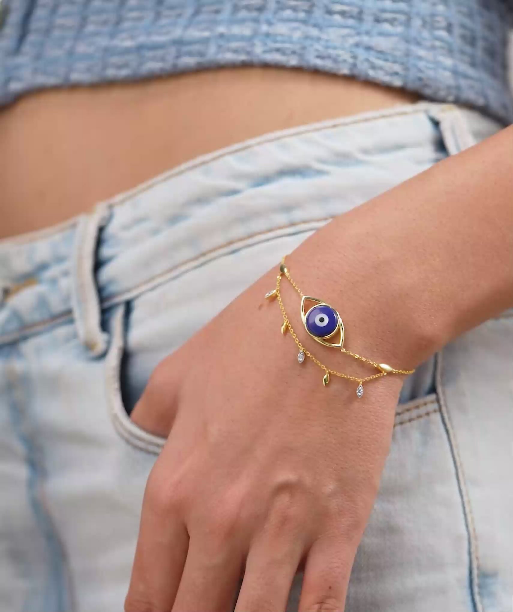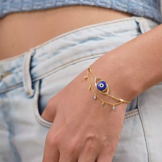 Embrace powerful protection with this striking, layered bracelet. The centerpiece features a bold blue enamel Evil Eye set within a dramatic gold frame. Two delicate chains hang below, adorned with sparkling marquise-cut crystals and polished gold teardrops that create a rich, cascading effect. Crafted in 18K gold vermeil on 925 sterling silver, it is anti-tarnish and hypoallergenic, ensuring it stays gentle on sensitive skin. This ornate piece serves as a modern talisman, perfect for evening gatherings or adding a layer of meaningful luxury to any outfit.