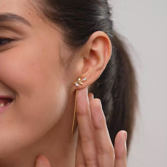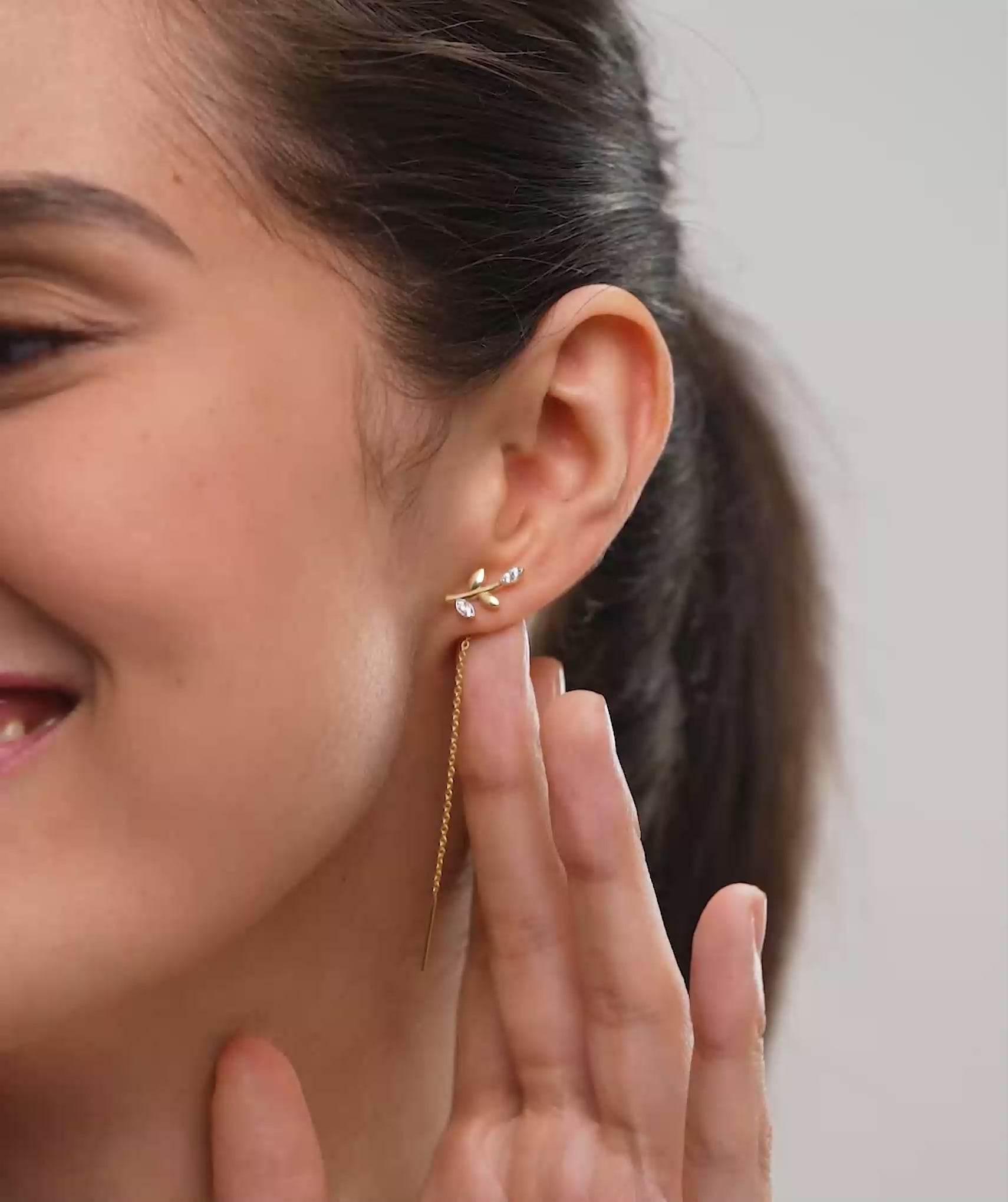 Graceful leaf motifs meet modern threader chains in this nature-inspired gold vermeil earring design.