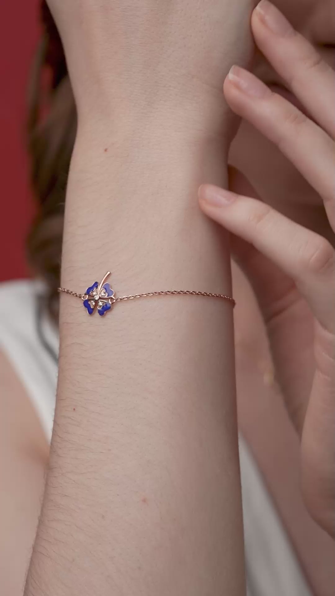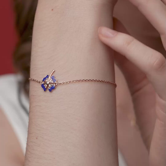 This is a delicate gold bracelet featuring a blue enamel four-leaf clover charm adorned with a sparkling diamond-studded cross at its center.