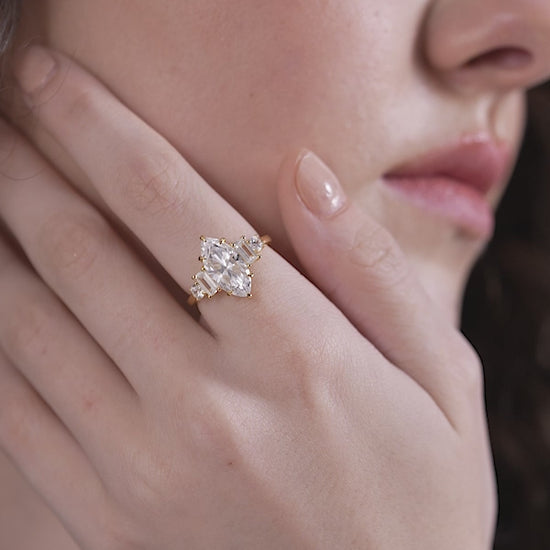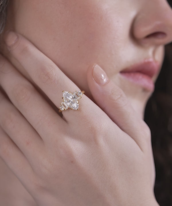 Exude vintage charm with this stunning Marquise & Baguette Vintage Ring, a design that beautifully blends classic curves with geometric precision. The spectacular marquise-cut centre stone is flanked by tapered baguette and round crystals, creating an Art Deco-inspired silhouette that elongates the finger for a graceful look. Crafted in 18K gold vermeil on 925 sterling silver, this ring is anti-tarnish and completely hypoallergenic, ensuring a luxurious feel that is safe for sensitive skin. Perfect for modern Indian women seeking a unique engagement ring or a sophisticated statement piece for festive celebrations, this ring guarantees you shine at every special occasion.