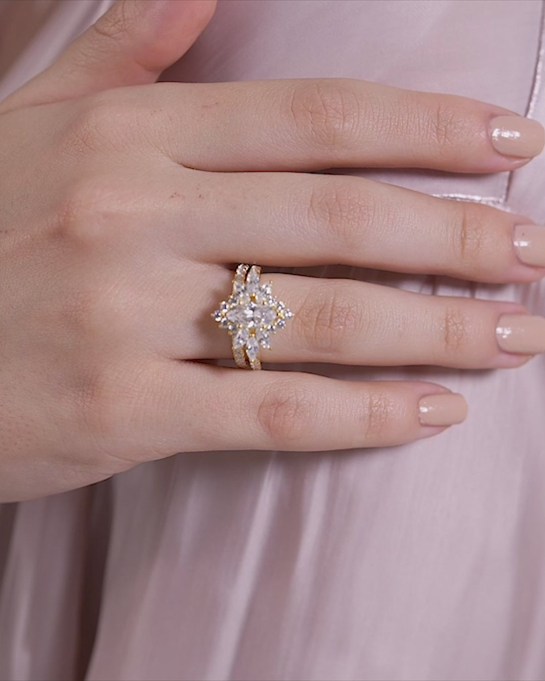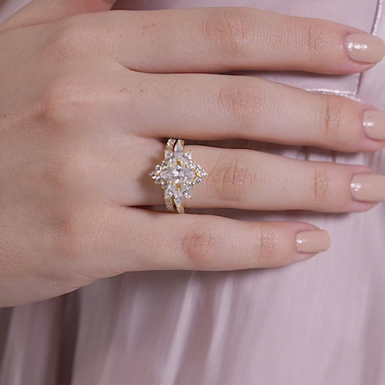 Radiate confidence and glamour with this magnificent Marquise Starburst Stack Ring, a statement set designed for the modern Indian woman who loves a touch of grandeur. This exquisite duo features a main ring with a brilliant marquise center stone surrounded by a "starburst" halo of smaller marquise and round crystals, paired perfectly with a matching full pavé eternity band. Crafted from high-quality 18K gold vermeil on 925 sterling silver, it is reliably anti tarnish and hypoallergenic, ensuring you can enjoy its luxurious shine comfortably. This dazzling set is the ultimate choice for party wear, weddings, and special occasions, allowing you to carry a bold, sparkling presence wherever you go.