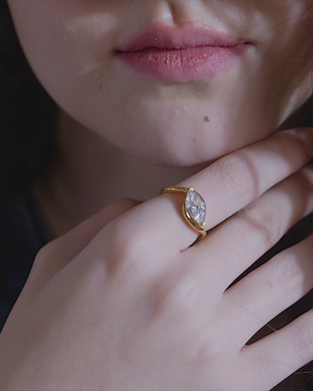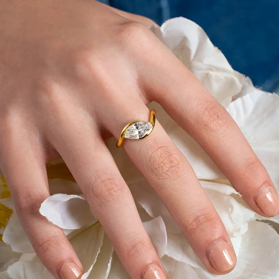 Make a sophisticated statement with this distinctive ring, featuring a brilliant marquise-cut stone set horizontally in a fluid, curved band. The modern east-west setting gives this classic shape a fresh, contemporary update that stands out on your finger. Crafted in 18K gold vermeil on 925 sterling silver, this piece is anti-tarnish and hypoallergenic, making it safe and comfortable for sensitive skin. Ideally suited for modern Indian women, this elegant design transitions effortlessly from a chic office accessory to a sparkling companion for date nights or festive parties.
