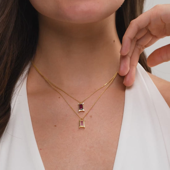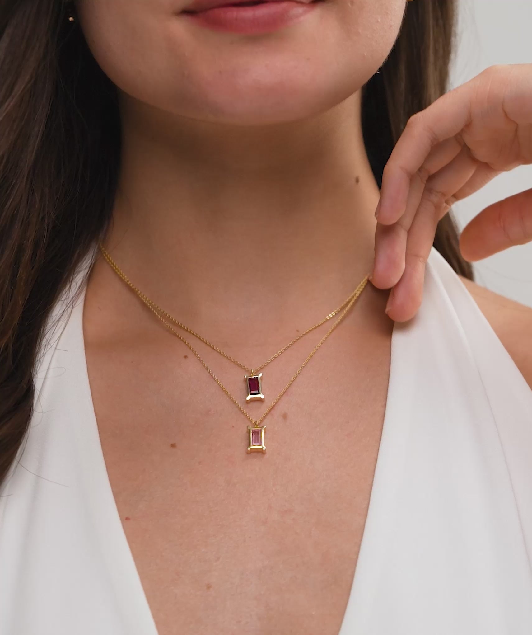 Add a vibrant touch of femininity to your daily look with this sleek pendant. The design features a bright pink baguette-cut stone set vertically in high-polished gold, offering a gorgeous pop of colour and strong, clean lines. Crafted in 18K gold vermeil on 925 sterling silver, it is anti-tarnish and hypoallergenic, ensuring comfortable all-day wear, even on sensitive skin. A stylish staple for the modern Indian woman, this lightweight necklace effortlessly elevates both casual wear and professional office attire.