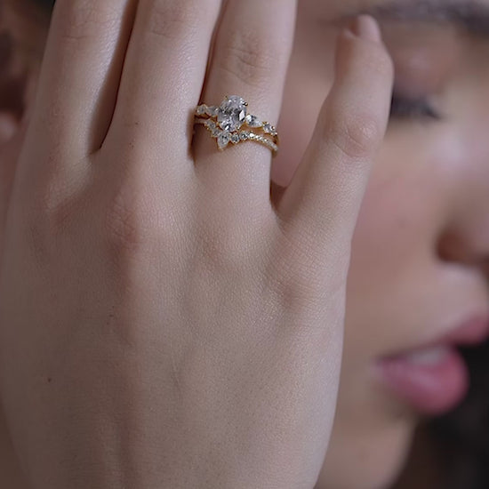 Capture the essence of vintage romance with this exquisite Oval Tiara Stack Ring, a dreamy set designed for the modern Indian woman who cherishes intricate details. The centerpiece features a luminous oval-cut stone accented by delicate marquise side stones, paired perfectly with a curved nesting band adorned with pear and round crystals that create a regal, tiara-like silhouette. Crafted in high-quality 18K gold vermeil on 925 sterling silver, this set is reliably anti tarnish and hypoallergenic, ensuring it remains kind to your skin forever. Whether chosen as a stunning bridal alternative, a promise set, or simply for elevating party wear, this stacking duo brings a touch of royalty to your everyday gold collection.