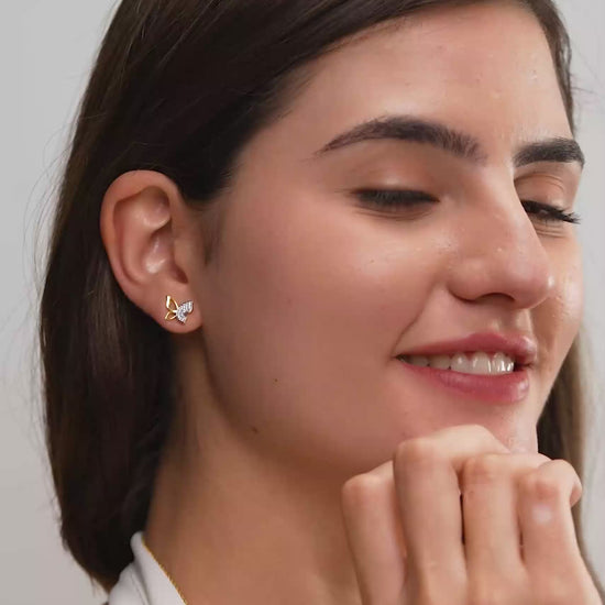 Capture the whimsy of nature with these delightful butterfly earrings. The design features a charming contrast, pairing a delicate open-gold wing with a shimmering pavé-set crystal wing for a look that is both playful and refined. Crafted in 18K gold vermeil on 925 sterling silver, they are anti-tarnish and hypoallergenic, ensuring a comfortable fit for sensitive ears throughout the day. Whether you are pairing them with a breezy kurti for a casual day out or adding a soft feminine touch to your workwear, these lightweight studs are a sweet essential for every woman’s jewellery box.