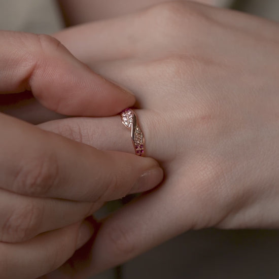 Romantic 18k gold vermeil jewelry set featuring a pink heart-shaped gemstone pendant necklace and a matching ring adorned with pink and white cubic zirconia.