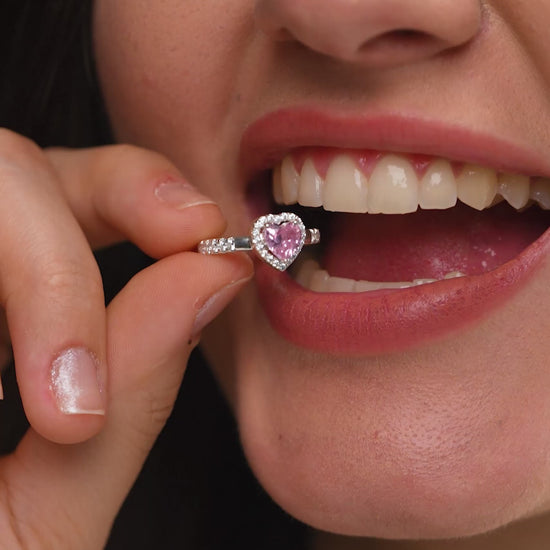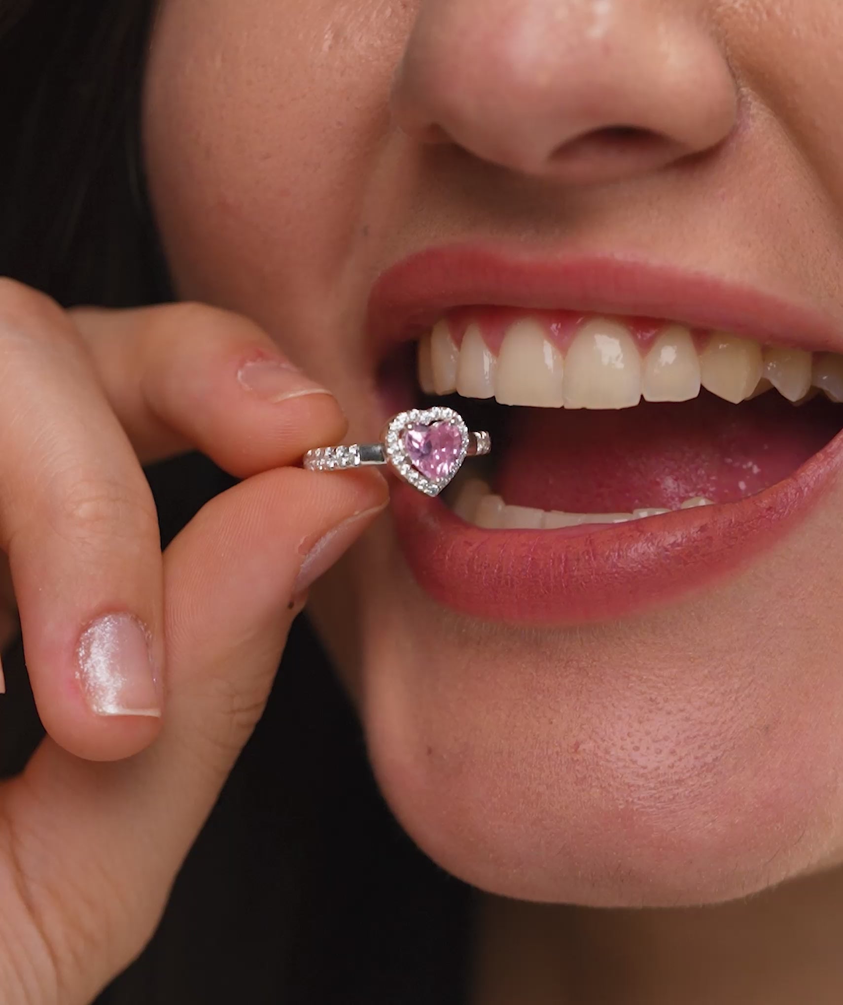 Charming 18k gold ring featuring a dazzling heart-shaped pink gemstone at its center, encircled by a halo of brilliant white diamonds.